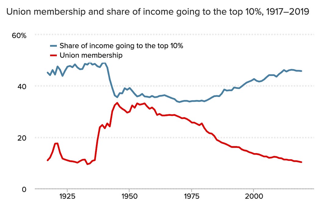 Friends, I was secretary of labor 30 years ago when the U.S. economy was producing an average of 200,000 new jobs a month. I remember holding news conferences on “jobs days” each month. I felt confident about the strength of the economy. What worried me then was that the new jobs didn’t pay well. (A disgruntled worker once called out to me, “Sure, Mr. Secretary, lots of new jobs. I’m doing three of them to make ends meet!”) Last Wednesday, the Labor Department reported that the United States produced an average of just 15,000 new jobs per month last year — a record low. And most paid sh*t. January showed an uptick in jobs, but almost all of the new jobs were in health care and construction. The rest of the economy seems to be shrinking. And wages are still stuck in the mud. Profits of big corporations have soared. The stock market values attached to these profits have risen even more. Yet average workers are barely making it. The U.S. economy is more distorted than ever. The widening gap between corporate profits and average workers — between capital and labor — helps explain the disconnect between a buoyant economy and pessimistic households. Consumer confidence is in the basement. The gap was widening before Trump was elected. It explains in part the rise of MAGA and why Trump won in 2016 and again in 2024. But Trump hasn’t done a thing to alter these trends. In fact, since he became president again, corporate profits (and the stock market) have done even better than before, while average workers have seen almost no gains in jobs or wages. “I think we have the greatest economy actually ever in history,” Trump said in an interview with Fox Business’s Larry Kudlow that aired Tuesday. That’s not what most Americans think. Even most young men — central to Trump’s wins in 2016 and 2024 — now believe they were better off under Biden. We’re not powerless to alter these trends. The “free market” doesn’t run on automatic. The rules of the economy depend on political decisions — such as tax laws, antitrust laws, and labor laws. Since Ronald Reagan was president, the nation has lowered taxes on the wealthy and raised them (especially Social Security and state sales taxes) on average Americans. America has also allowed big corporations to monopolize the economy — which has given them the power to raise prices without worrying that a competitor will grab consumers away. And what about labor laws? Take a look at this chart. The blue line represents the percentage of the national income going to the richest 10 percent — that is, how much of every dollar earned in the United States goes into the pockets of the wealthiest tenth of Americans. The red line represents the percentage of workers that belong to a union. Notice a pattern? The 1940s and 50s saw a dramatic rise in union membership. Laws and public policies encouraged unionization. That was also a time when a growing portion of the nation’s income went into the pockets of ordinary working people instead of the pockets of the richest 10 percent. That’s because unions give workers more bargaining power to get a larger share of the profits they helped generate. The benefits of unions helped nonunion workers too. In order to attract workers, corporations that didn’t have unions had to increase the pay of their workers, too. As a result, by the mid-1950s, America’s economy was powered by the biggest middle class this nation had ever seen. Racial and gender disparities were still a big problem, but America was making progress on them as income inequality trended downward. So what happened? As you can see, union membership started to decline in the 1970s. That was after Lewis Powell — soon to be a justice on the Supreme Court, then an attorney in Richmond, Virginia — urged the U.S. Chamber of Commerce and the leaders of American corporations to pour great wads of money into American politics. Corporations doubled-down on busting unions, while their allies in government weakened labor laws. Then, starting with Ronald Reagan in the early 1980s, corporate attacks on unions got turbocharged. Reagan fired the striking air-traffic controllers. Legally, they had no right to strike, but Reagan’s move legitimized a far broader assault on American unions. Since then, unions have steadily shrunk, and the gap between the rich and everyone else has taken off. I saw it when I was secretary of labor in the 1990s. I was worried then. I’m far more worried now. Today, the top 10 percent are doing okay, largely because they own 92 percent of the value of all the shares of stock owned by Americans, and the stock market is doing just fine. The real wealth of the nation has now concentrated in the richest one-tenth of 1 percent. And the bottom 90 percent are barely holding on. My friends, this is not bad only for the bottom 90 percent. It’s also bad for the economy and dangerous for our democracy. If unaddressed, it could lead to more demagogues like Trump as far as the eye can see. As the great jurist Louis Brandeis is reputed to have said: America has a choice. We can have great wealth in the hands of a few, or we can have a democracy, but we cannot have both. If we want to make sure our economy works for everyone, not just the super-rich, we need to build back union power. A resurgence of labor unions would go a long way toward fighting inequality, rebuilding a large and vibrant middle class, and making life better for all Americans. Which is why it’s vital that we support unions. Please take a look below, and share: So glad you can be here today. Please consider becoming a paid subscriber of this community so we can do even more. |