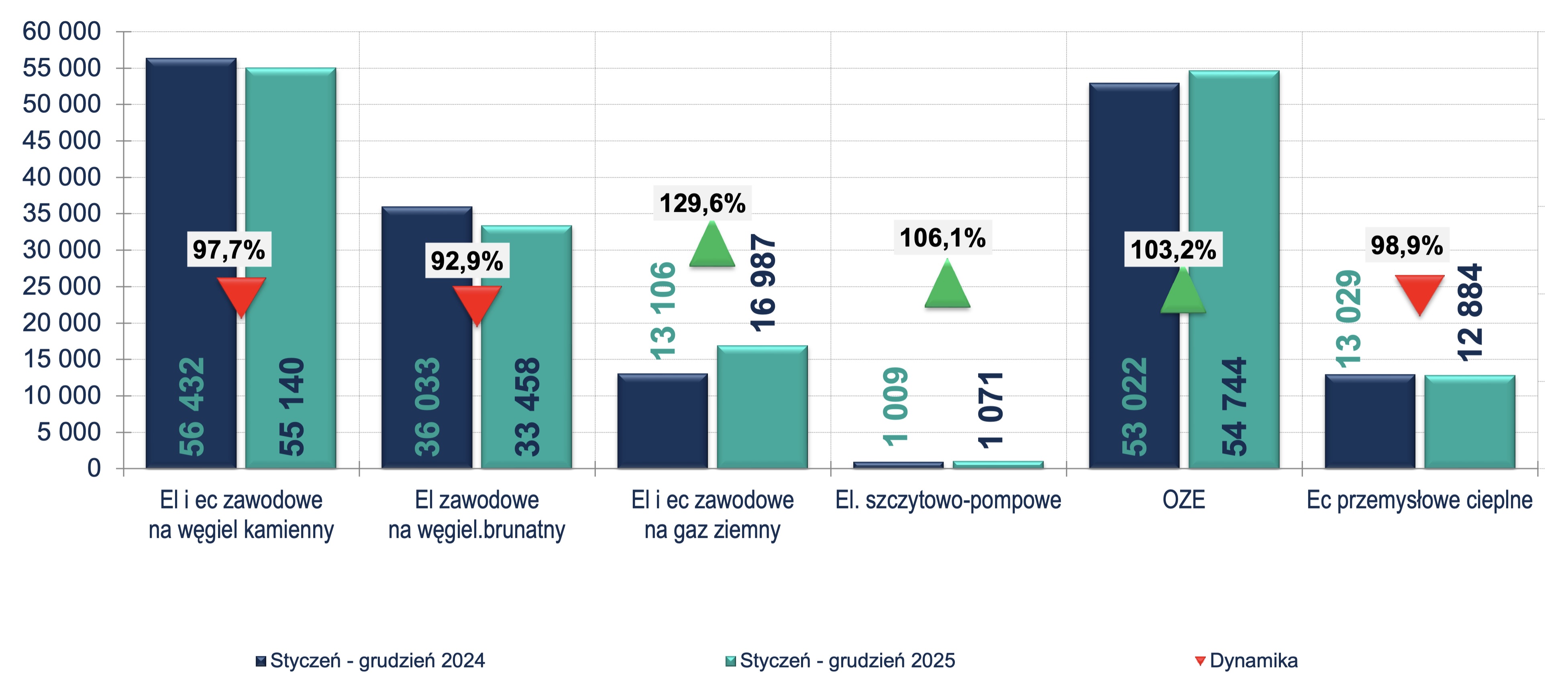 Zgodnie z trendem dekarbonizacji, gaz ziemny zwiększył swój udział w miksie do poziomu 13,9%. Jednocześnie odnotowano spadek znaczenia węgla kamiennego (do 50,9%) oraz węgla brunatnego (do 29,1%). Dodatkowo, dzięki redukcji wskaźnika zużycia własnego o 19,9%, wytwarzanie energii z gazu w elektrociepłowniach zawodowych stało się bardziej efektywne i sprawne.