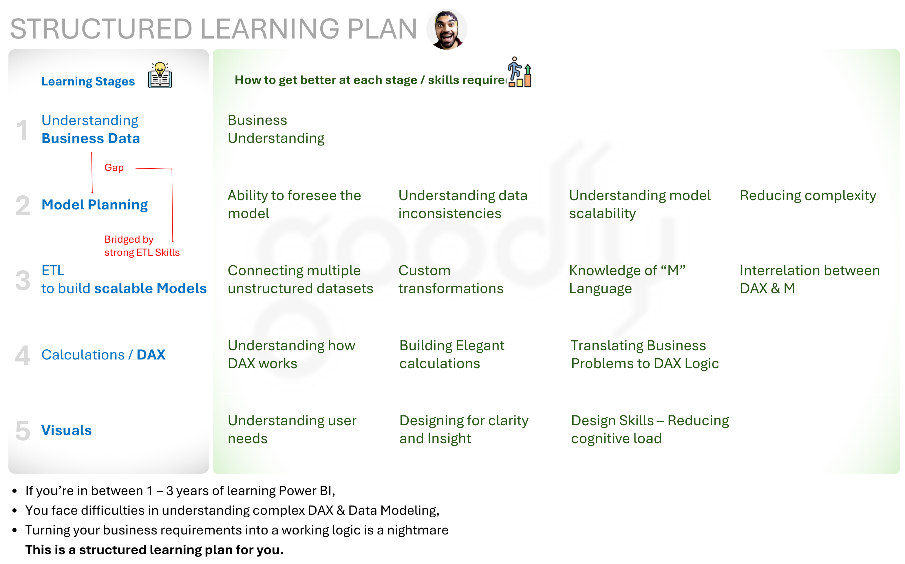 I’ve put together a learning plan that shows the right approach to learn Power BI and how to get better at each stage.