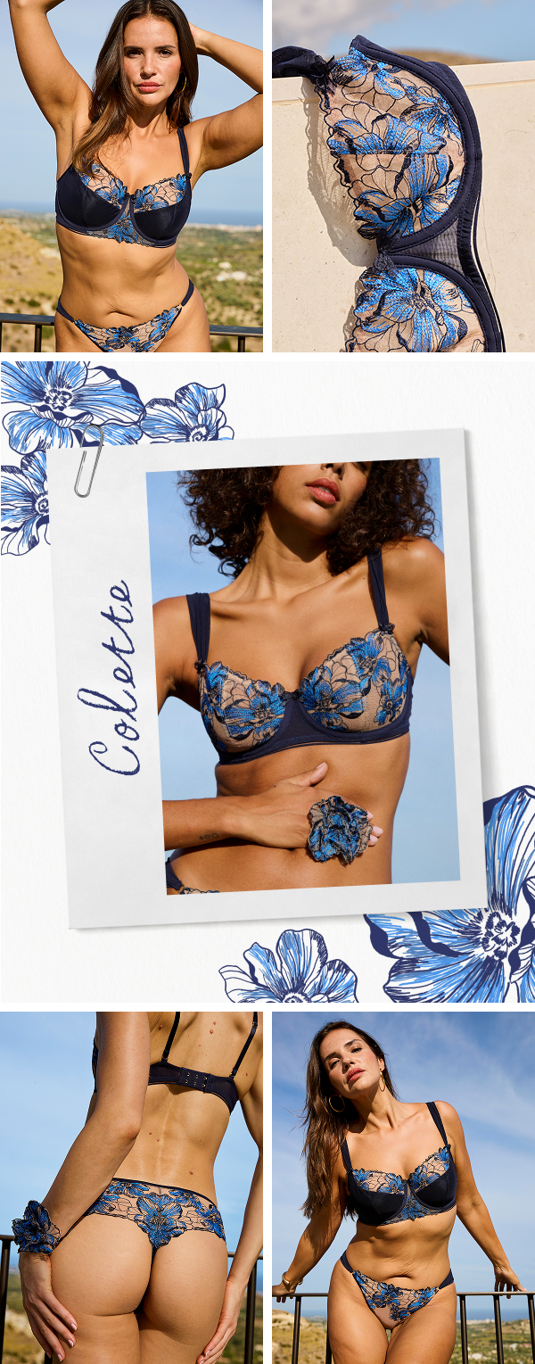 Colette łączy delikatny kwiatowy haft z wyrazistą, niebieską paletą barw.