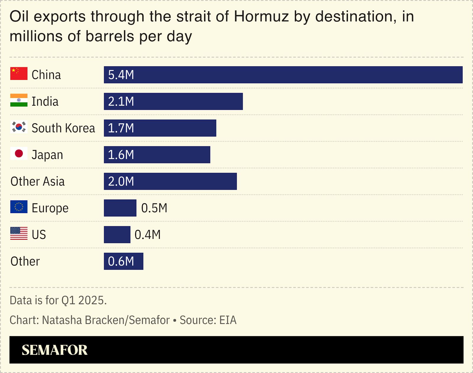 Oil prices extended their gains as the conflict surrounding Iran showed no sign of slowing down. Goldman Sachs raised its near-term price forecast by $10 per barrel, as attacks on tankers persisted — around 10 have been targeted in the Gulf or in waters near Oman since the war started — and Iraq began to shut down production at its biggest fields because of the closure of the Strait of Hormuz and a lack of storage facilities. Kuwait could be next to see production cuts, analysts warned. Saudi Aramco’s Ras Tanura refinery also came under a fresh attack on Wednesday, although there was no damage, and QatarEnergy has declared force majeure on LNG shipments, having said earlier in the week it had halted production amid the Iranian strikes. Aramco is also now reviewing alternatives to shipping oil through the Gulf, including using its east-west pipeline to export crude via the Red Sea, and relying on Egypt’s Sumed pipeline to the Mediterranean, people familiar with the matter told Semafor. Despite the insurance and military assurances offered this week by Trump, “many shipping industry insiders remain cautious,” Stamatis Tsantanis, CEO of the shipping company Seanergy Maritime, said in a statement. “Shipowners and operators will need to see a clear, secure corridor established before confidence fully returns.” In the meantime, the price of insurance for ships wishing to cross the Strait rose further, up about 400% since before the weekend, according to the brokerage Marsh. –Tim McDonnell and Matthew Martin |
