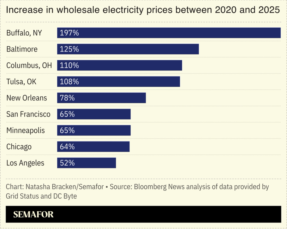 Leading tech executives met at the White House on Wednesday to promise to shoulder more of their data centers’ energy costs, but many of the real solutions are out of the Trump administration’s hands. Executives from Amazon, Google, Meta, Microsoft, xAI, Oracle, and OpenAI signed a “ratepayer protection pledge,” which Trump said will have “a tremendous impact on electricity costs.” The pledge doesn’t include any specific new policies to help tech companies finance or build new energy projects. It will ultimately fall to state and local regulators to continue hammering out the specific rate structures that will induce greater investment in the grid near data centers, and power project developers will still contend with years-long backlogs for gas turbines and other necessary equipment. Still, for tech companies that are keen to avoid conflict with the administration, the pledge will likely produce some tangible results, Jeff Jakubiak, energy regulation partner at the law firm Vinson & Elkins, told Semafor: “I think is going to result in more generation than otherwise would have been built.” |