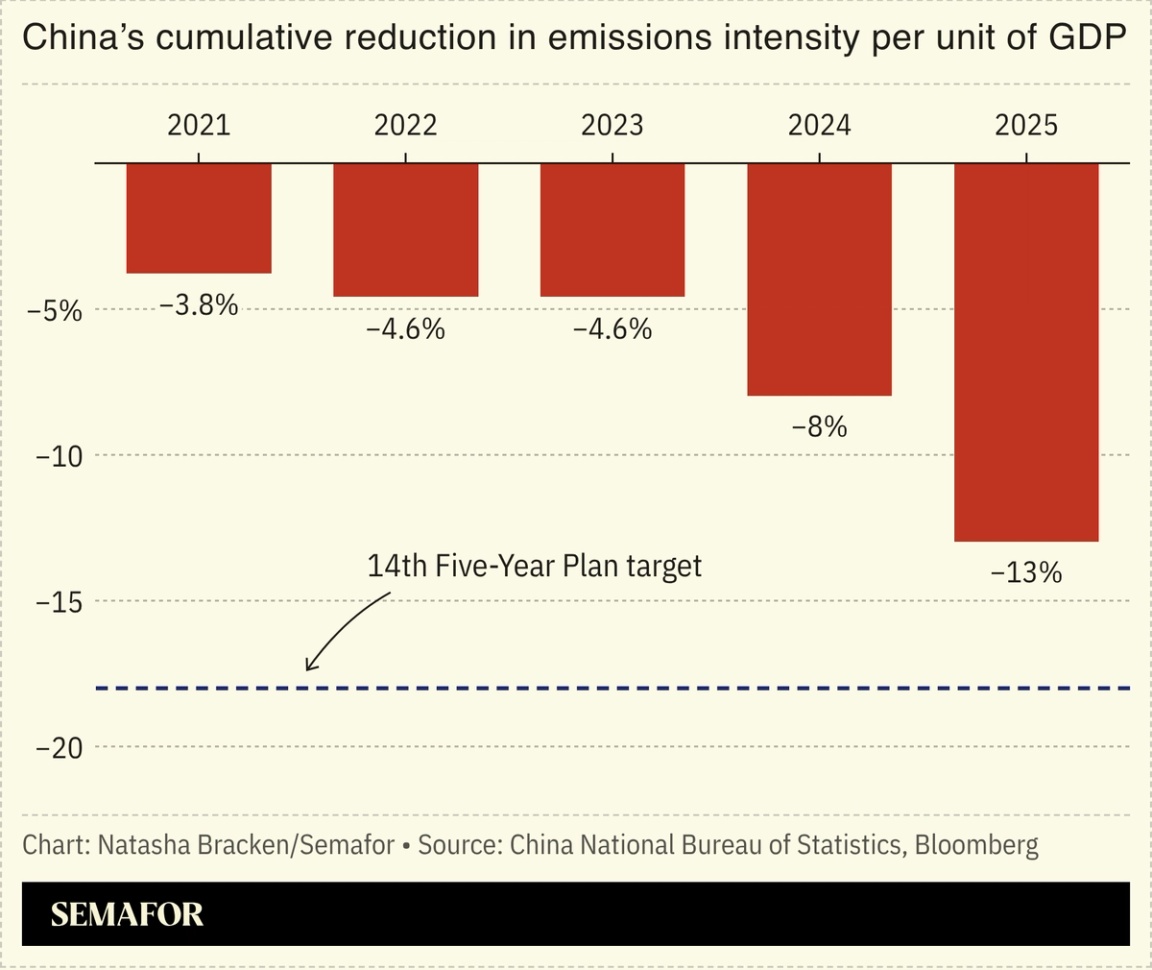 China is targeting a 17% cut in carbon intensity under its 15th five-year plan, it announced Thursday, as the country declares its ambition to “lead global climate governance.” The plan drops long-standing energy intensity targets, reflecting a shift toward measuring climate progress based directly on emissions. Greenpeace said that meant the pace of total emissions reductions will depend mostly on whether renewable energy deployment can keep pace with overall economic growth. Beijing’s renewables rollout, which now accounts for roughly 11% of China’s GDP, is set to continue through the decade: The latest five-year plan calls for replacing 30 million metric tons of coal with renewables annually and aims to bring coal to peak consumption by 2030, but stops short of stricter caps. Beijing wants non-fossil fuels to reach a quarter of total energy use by the end of the decade, up from 21% last year. The plan reaffirmed China’s conviction to “fully implement” the UN’s climate convention and the Paris Agreement, just as US President Donald Trump withdrew from the Paris accord for a second time, and exited a string of UN climate bodies. —Natasha Bracken |