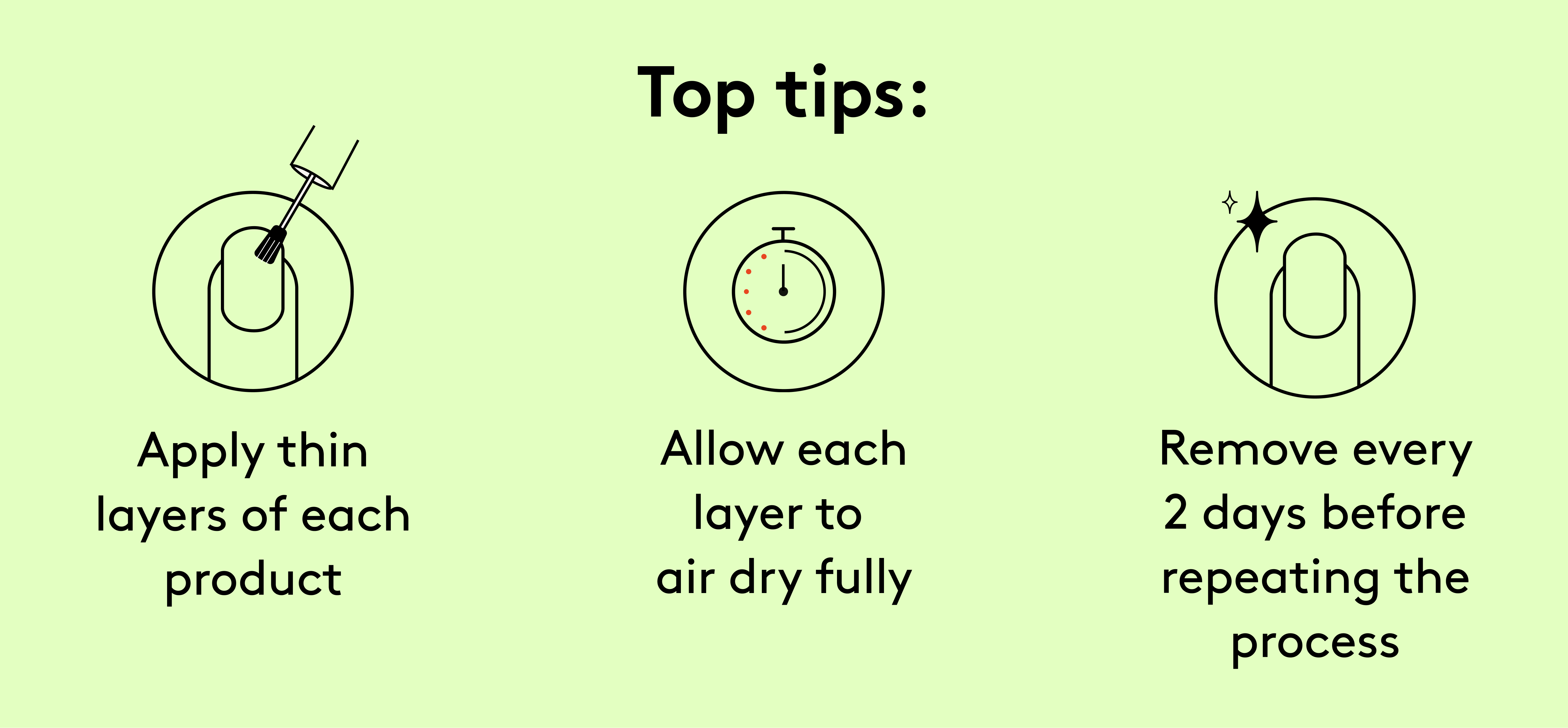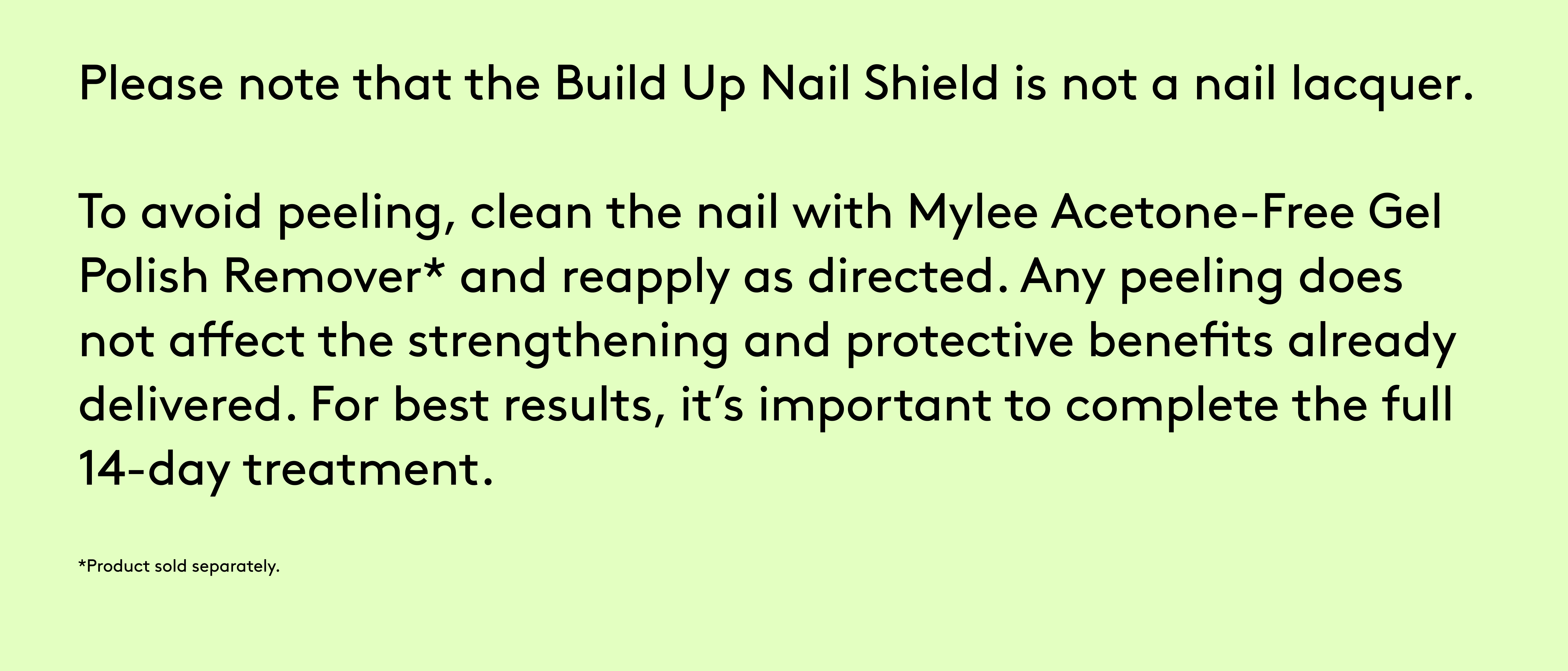 After two days, remove both products using Mylee Acetone-Free Gel Polish Remover*, then repeat the full application process. For best results, continue consistently for 14 days as a complete nail routine to help restore strength, shine and resilience.