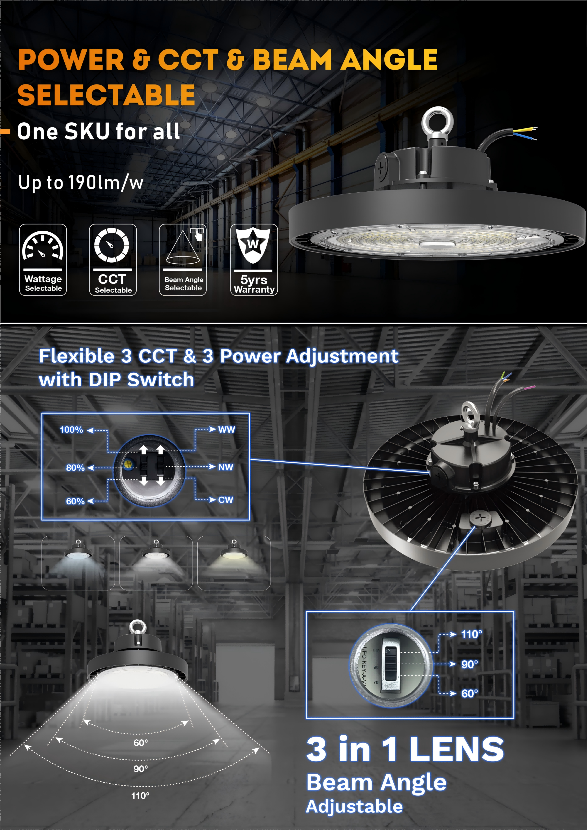 Our multi-functional LED High Bay Light has 3 adjustable power, 3 color temps and 3 beam angles, meeting diverse demands and cutting inventory cost.