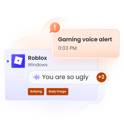 Monitor gaming chats Gaming voice alerts adds an extra layer of protection in a space that can be hard to monitor. Get notified if your child has a concerning interaction on popular platforms like Roblox, Fortnite, Valorant, and Steam*. *Gaming voice alerts available on Windows devices. |