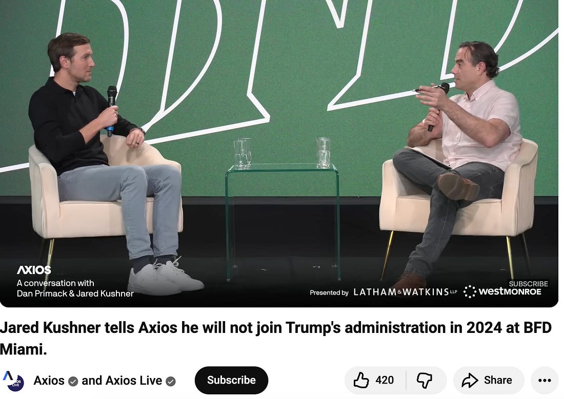 “The sooner David Ellison takes over that network, the better.” That is what “Secretary of War” Pete Hegseth said last Friday about CNN. David Ellison is the son of Trump-supporting billionaire Larry Ellison, who financed the transaction. The Ellisons’ pending purchase of CNN is only one of many ways that the Trump administration is distorting the media landscape. In a social media post this weekend, Donald Trump highlighted the many ways he is “RESHAPING THE MEDIA” — including the ouster of Stephen Colbert at CBS, the defunding of PBS, and the political weaponization of the FCC. As today’s piece illustrates, Popular Information bucks this trend. We continue to call out lies, root out corruption, and follow the money. This perilous moment demands we redouble our efforts and accelerate our growth. You can support this work by upgrading to a paid subscription. After Donald Trump won the presidency in 2024, Jared Kushner, his son-in-law, dismissed concerns that his private equity firm would be a vehicle to buy foreign influence. In December 2024, Kushner said that he “preemptively” raised $1.5 billion earlier that year. The $1.5 billion came from Qatar’s sovereign wealth fund and Lunate, an investment fund linked to the UAE government. The influx of cash, Kushner said, would allow his firm “to avoid any conflicts” and ensure “we don’t have to raise capital for the next four years.” Kushner made the comments on the December 20, 2024, edition of “Invest Like The Best,” a podcast hosted by Patrick O’Shaughnessy. Kushner’s claim that he would not raise additional money during Trump’s presidency to avoid conflicts turned out to be a lie. On Friday, the New York Times reported that Kushner “has spoken with potential investors in recent weeks about raising $5 billion or more for Affinity Partners.” Kushner’s team has “already met with Saudi Arabia’s Public Investment Fund [PIF].” PIF, Kushner’s biggest client, invested $2 billion with Affinity Partners in 2021. According to the report, Kushner is also seeking additional funds from Qatar and the UAE. Kushner reportedly tried to drum up new investments while at the World Economic Forum in Davos as part of the official Trump administration delegation. Kushner is seeking billions in additional funding from the Saudi government as he serves as one of Trump’s top negotiators with Iran. Notably, “Saudi Crown Prince Mohammed bin Salman [MBS] made multiple private phone calls to Trump” in February, advocating a U.S. attack,” according to reporting in the Washington Post. Last week, Trump said Kushner was one of a handful of top advisers who convinced him to launch major combat operations in Iran. According to CNN, the UAE was also lobbying the Trump administration to strike Iran. After leaving the White House in 2021 and quickly accepting billions from PIF, Kushner acted as a de facto foreign policy advisor to Saudi Arabia. According to a Reuters report, Kushner advised MBS on “U.S.-Saudi diplomatic negotiations involving Israel…multiple times.” Since Trump’s second inauguration, Kushner has resumed his role as one of his father-in-law’s most important foreign policy advisors. Kushner has been one of the administration’s top diplomats for nearly every major foreign policy issue — from the war in Ukraine to Gaza to Iran. Kushner’s deep involvement with the Trump administration’s foreign policy also breaks a pledge he made before Trump’s second term. In February 2024, at an event hosted by Axios, Kushner was asked whether accepting billions in investments from Middle Eastern governments would make it “very difficult… to do any sort of foreign policy work” in a second Trump administration. “I’m an investor now,” Kushner replied. “I served in government, and I think my track record is pretty impeccable. Now I’m a private investor.” Axios titled the video, “Jared Kushner tells Axios he will not join Trump’s administration.” During the December 2024 podcast with O’Shaughnessy, Kushner presented himself as law-abiding and scrupulously ethical. At the same time, Kushner insisted his critics were ignorant people who did not understand how business is done. “I’m not going to allow people like the media or these ethics experts, who quite frankly don’t have real jobs and get paid to try to find potential conflicts that don’t exist, to change what we think and what we’re going to do,” Kushner said. Kushner’s dual role and the ConstitutionIs it permissible for Kushner to hold a key position in the Trump administration while simultaneously accepting tens of millions in fees from foreign governments? Not according to the Foreign Emoluments Clause of the Constitution, which prohibits someone “holding any Office of Profit or Trust” from the federal government from accepting “any present, Emolument, Office, or Title, of any kind whatever, from any King, Princ |