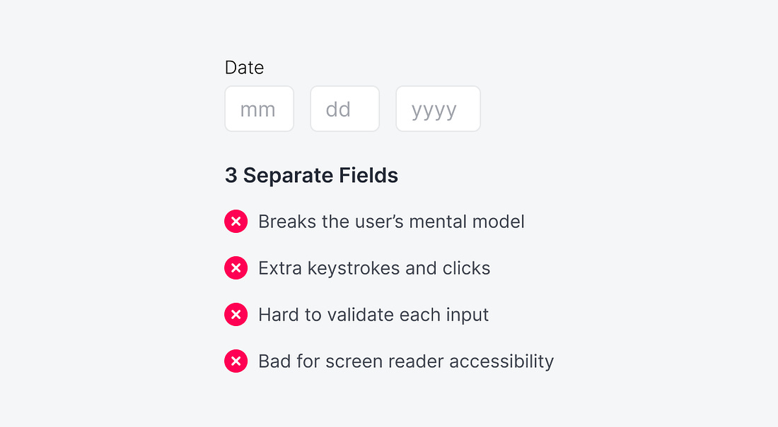 How easy is it for users to enter dates on your form? Dates are one of the most common form fields that designers poorly implement. The design pattern you choose directly impacts speed, accuracy, and accessibility. Here’s a look at three bad patterns to avoid and the best pattern to adopt. 3 Separate FieldsSeparating the date input into three fields increases cognitive load with no real benefit. Most users think of a date as a single entity, so fragmenting it into month, day, and year fields breaks that mental model and forces artificial pauses mid-entry. Continue reading this post for free in the Substack app |
