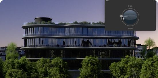 Redshift respects the real-world time of day and GPS data saved in your Vectorworks project. But creativity doesn’t have to stick to the clock. Shift from morning light to golden hour to dusk and instantly see how sunlight, shadows, and sky transform your design.