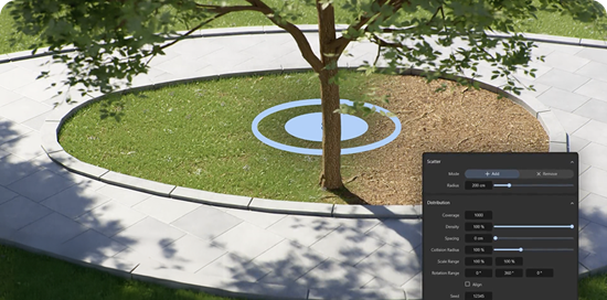 Using our integrated asset library, quickly furnish interiors and exteriors with high-quality assets to enhance your architectural renderings with cinematic detail. The ever-growing library offers a drag-and-drop ready assortment of furniture, vehicles, realistic plants, and people that easily snap into place and interact naturally with surfaces.