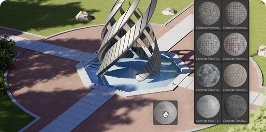 Choose from a rich collection of physically accurate materials, from concrete and metal to glass, wood, and textiles. Each reacts naturally to light and environment, to bring your designs to life. Apply, adjust, and preview everything live until it feels just right.