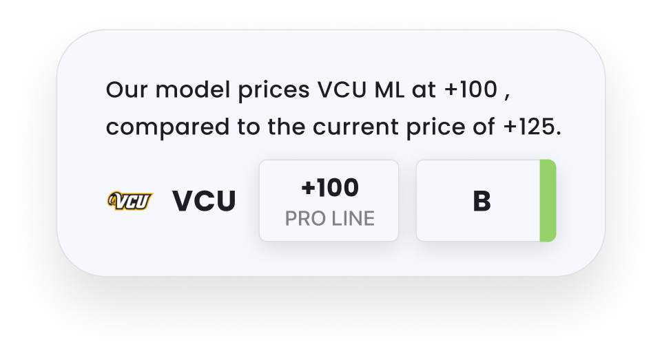 Convert the sportsbook line to a probability with our prediction markets calculator, then compare it to the PRO projection. For example, VCU is trading at 43% on Kalshi, which converts to +133 odds.
