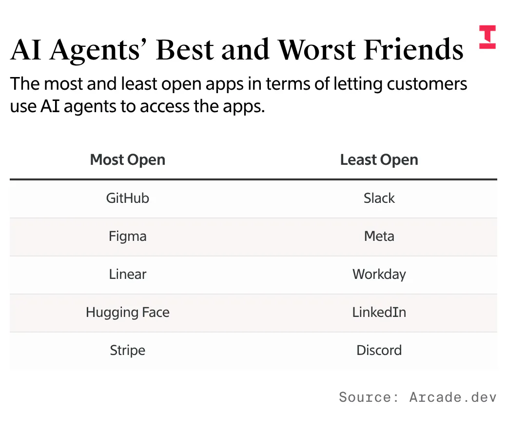 The ranking, from startup Arcade.dev, shows that the most closed-off apps are Slack, Workday, Meta’s platform for advertisers and Whatsapp. On the other hand, GitHub and Figma are the most open.