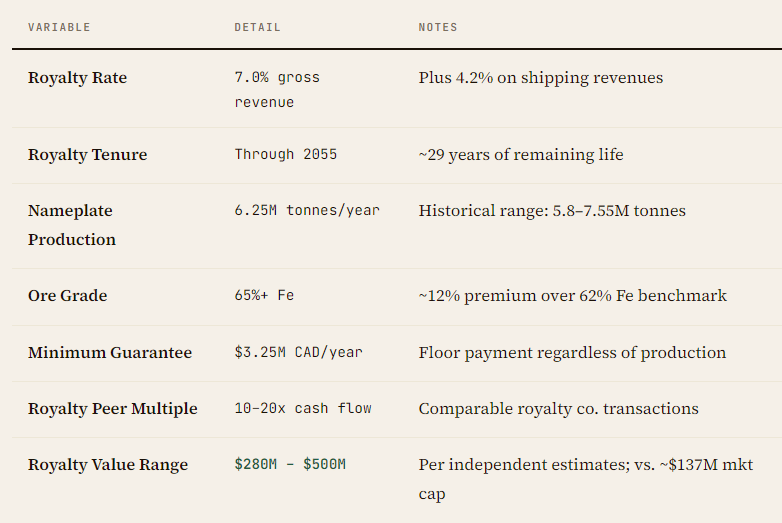 First, the underlying asset is genuinely world-class. A 29-year royalty on a high-grade Canadian iron ore mine is a rare, durable asset that should command premium multiples. It hasn't, because of everything else happening around it.