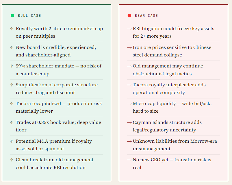 5. Royalty monetization. The ultimate bull case is the new board seeking a buyer for the royalty asset itself, or a spin-off that allows the royalty to trade at proper comparable multiples. This is not a near-term certainty, but it is the scenario that creates 2–4x returns from today's price.