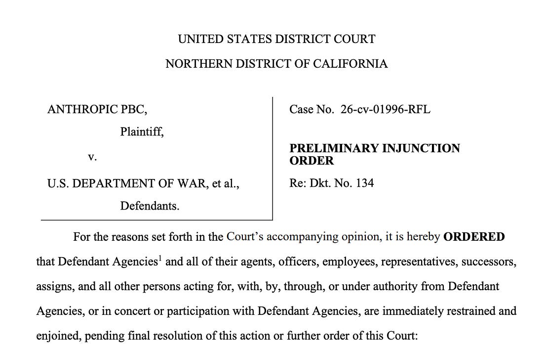 Last night, I cautioned that there was a lot going on and that we would be playing catch-up today. There is so much that I’m trying to highlight some of the most significant ones in standalone pieces to make them digestible. Earlier today, we took up DOJ’s release of information related to the now-dismissed classified documents case that can’t have made Donald Trump happy. Here’s today’s second installment. “The United States of America will never allow a radical left, woke company to dictate how our great military fights and wins wars,” Donald Trump posted on social media after Anthropic, maker of the AI model Claude, pushed back when the Department of Defense wanted to cross ethical red lines Anthropic had set for the use of its product. Anthropic opposed the use of its model for fully autonomous weapons or domestic mass surveillance. The Trump administration responded by designating Anthropic a “supply chain risk,” a step that compromised not only Anthropic’s work with the government but also its work with virtually any other entity that wanted to do business with the Pentagon. Trump ordered all U.S. agencies to stop using the company’s products. Anthropic was essentially blacklisted. So they sued. We discussed that when it happened. Tonight, Judge Rita F. Lin in the Northern District of California entered the preliminary injunction Anthropic requested, blocking the Pentagon’s order. She wrote: “Nothing in the governing statute supports the Orwellian notion that an American company may be branded a potential adversary and saboteur of the U.S. for expressing disagreement with the government.” The dispute is not about whether the government can decide to replace Anthropic with another, more compliant AI partner. It can, and Judge Lin explicitly said so. Before the Department of Defense took the retaliatory step of designating it a supply chain risk, Anthropic also said so, and offered to help the government transition to a relationship with another company. The significance of Judge Lin’s order is that it prohibits the administration from taking retaliatory steps against the company for refusing to violate its own red lines. The government could try to appeal this decision, or simply move on and separate from Anthropic. And there is still a parallel lawsuit before the Court of Appeals in Washington, D.C., that hasn’t been decided. So the case is far from over, but at least for now, another federal judge has rejected the administration’s efforts to come down hard on anyone who opposes it. Judge Lin ruled that the government can’t punish Anthropic for refusing to cross the ethical boundaries it has set for itself. Anthropic was founded by former OpenAI executives. They explain their mission like this: “Every day, we make critical decisions that inform our ability to achieve our mission. Shaping the future of AI and, in turn, the future of our world is a responsibility and a privilege. Our values guide how we work together, the decisions we make, and ultimately how we show up for each other and work toward our mission.” Anthropic is the first U.S. company to receive the supply chain risk designation. Before this, it has been reserved for foreign companies that pose…an actual risk to the supply chain. In a hearing earlier this week, the parties hashed out some of the issues in court before Judge Lin. She commented on the unusual designation of an American company, saying that the provision was typically directed at foreign terrorists and other hostile actors. While DoD was free to stop using Claude, in her view, it looked like the government was punishing Anthropic for publicizing its dispute with the government over how Claude could be used. She seemed inclined to believe that Anthropic had the right to discuss its dispute with the government publicly, and that trying to prevent it from doing so violated the First Amendment. Her order prohibits the government from “implementing, applying, or enforcing” the February 27, 2026, Presidential Directive ordering all federal agencies to stop using Anthropic’s technology. It has various additional provisions designed to prevent agencies from acting based on the directive and to prevent the government from looking for ways to have government employees or contractors implement it. The government is also banned from “implementing, applying or enforcing in any manner” Hegseth’s designation of Anthropic as a supply chain risk. The Judge gave the Trump administration until April 6 to file a status report describing the steps it has taken to ensure the government is complying with the court’s order. She is also requiring a certificate of compliance with the order’s requirement. Although this case isn’t over, it’s headed in the right direction. If you read Civil Discourse because you want to understand what the headlines actually mean—and not just react to them—paid subscribers make that level of analysis possible. For the price of a couple cups of coffee each month, you get the perspective of someone who has spent decades inside the legal system explaining how the pieces really fit together. We’re in this together, Joyce You're currently a free subscriber to Civil Discourse with Joyce Vance . For the full experience, |