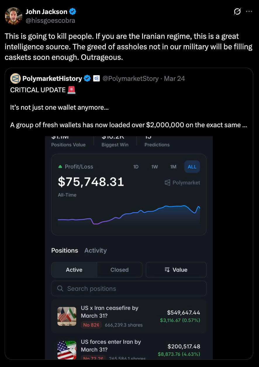 This is a public post so please share it widely. If you enjoy this newsletter, I hope you’ll consider upgrading to a paid subscription. For those who don’t want a Substack account, you can keep Off Message going with a donation. All support is appreciated, and donations of $75 or larger come with a comped annual subscription—all content unlocked and emailed to the address provided. Expose ALL Of Trump's War ProfiteeringIt can serve as a downpayment to the world on our commitment to restore accountable democracy to America.We can say this much about Donald Trump, his advisers, and their many servants in other branches of government: They are prolific coverup artists, but poor craftsmen. This became evident in Trump’s first term—indeed even in his first campaign—but the pattern has accelerated in his second, as the criminality has become more rampant. They most famously botched the Epstein files coverup. And now two more coverups—both involving the exploitation of state secrets for private profit—are unraveling simultaneously. The underlying scandals are distinct, and separated by years, but now threaten to collide. One was supposed to have been put to bed when Trump won the 2024 election, effectively terminating Special Counsel Jack Smith’s prosecution of Trump’s theft and concealment of highly classified documents. Aileen Cannon, the corrupt, Trump-appointed judge in that case, had already ordered the case dismissed on frivolous grounds. When Trump won, the government withdrew from its appeal, all but ensuring he would never face trial. And to complete the coverup, Cannon issued a protective order sealing Smith’s official report on the investigation, so that the public couldn’t read it. This coverup began to fall apart on Wednesday, when Trump’s Justice Department accidentally produced documents from Smith’s report to Congress that speak to Trump’s motive. The document-production process stemmed from an ongoing Republican effort to discredit Smith—to pile dirt on top of the coverup—through selective disclosure. In their haste and sloppiness, DOJ officials accidentally confirmed that all this secrecy is about more than simply protecting Trump from embarrassment. It shows that prosecutors believed Trump stole classified information—which included planning documents for war against Iran—for personal profit. In a January 13, 2023 memorandum, which was brought to light by House Judiciary Committee Ranking Member Jamie Raskin, “prosecutors wrote that the [FBI] has determined that the classified documents President Trump retained from the White House ‘were commingled with documents created after Trump left office.’ FBI has also found that certain classified documents President Trump improperly retained ‘would be pertinent to certain business interests.’ DOJ prosecutors further assessed that these’“classified documents pertinent to his business interests’ established ‘a motive for retaining them.’” That’s the first faltering coverup. The second stems from the fact that political insiders who trade on government secrets leave breadcrumbs for investigators. On March 16, Trump loyalists ousted the top enforcement official at the Securities and Exchange Commission, one of the few federal regulators with jurisdiction to investigate insider trading. She had reportedly “clashed with agency leaders over the direction of its enforcement program, including the handling of cases with ties to President Donald Trump and his family.” Then on Monday, just a few minutes before Trump announced a phased de-escalation of his war against Iran, an individual or individuals with advanced knowledge of his plans bet hundreds of millions of dollars that oil prices would drop, reaping over a billion dollars in profit. This was just the most conspicuous trade. On unregulated betting markets, people are setting themselves up to make millions if Trump re-escalates, wagering on the precise timing of a land-invasion of Iran. Here’s one example from Polymarket. Are these Trump insiders or merely reckless speculators? Would you place bets this large if you were shooting in the dark? Or has Trump created a culture of corruption through his own profiteering, in which getting rich off state secrets, stealing from other investors, and endangering U.S. service members has become standard practice? |
