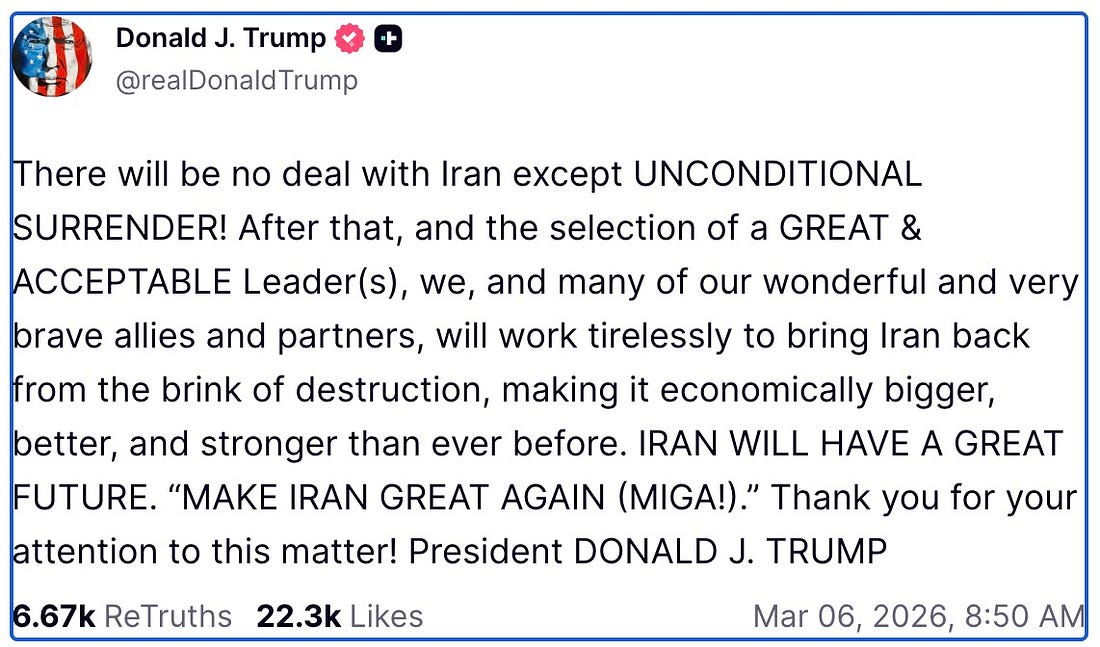 Hey fam: This edition is unlocked as a public service because when you see all of Trump’s shifting Iran demands / timelines laid out in one place the effect is . . . Sickening? Humiliating? Hilarious? But it’s not about dunking on him. When you see how erratic and foolish Trump is, you understand why we’re losing this war. And as I try to explain in the second item, however much we’ve lost already, we can still do worse. At this point our options are (1) lose the Iran fight, but hold on to the petrodollar and our relative position in the global order, or (2) experience our own version of the Suez crisis in which the entire global balance of power moves eastward by several thousand miles. If you find value in laying out all of this material and then using it to think deeply about what it means for the future . . . well, this is what we try to do here at The Bulwark every day. Come join us. This is a community where we try to make each other smarter and help each other see around corners. Programming note: The president has just started a press conference. We’re watching and we plan to do a livestream if he says something noteworthy. Check the homepage. 1. The TimelineLast week President Trump said that he didn’t care whether or not the Strait of Hormuz was reopened because it wasn’t America’s problem. On Sunday he demanded the strait be reopened in two days or he would begin a campaign of war crimes against Iran. Which is it? That’s a trick question, obviously. The answer is the former; or maybe the later. Or both. Or neither. I don’t know about you, but until recently I had forgotten that President Trump originally demanded the Iranian regime accede to “unconditional surrender.” That’s so far in the rearview that literally no one ever brings it up anymore. Why haven’t reporters asked Trump why he’s negotiating about opening the Strait of Hormuz when he originally said that nothing short of “unconditional surrender” would be accepted? When you start radically revamping your win conditions, doesn’t that mean that you’re losing? But of course it’s not that simple. This isn’t really about “winning” and “losing.” Because when you put all of Trump’s shifting demands, conditions, and timelines together in one place and just read them chronologically, you get a picture of either a degenerate bullshitter, or a man who’s lost his mind. Here are all of the war demands made (so far) by the president of these United States. February 28: “Our objective is to defend the American people by eliminating imminent threats from the Iranian regime, a vicious group of very hard, terrible people. Its menacing activities directly endanger the United States, our troops, our bases overseas, and our allies throughout the world. . . . “[T]o the great proud people of Iran, I say tonight that the hour of your freedom is at hand. Stay sheltered. Don’t leave your home. It’s very dangerous outside. Bombs will be dropping everywhere. When we are finished, take over your government. It will be yours to take. This will be probably your only chance for generations.” March 2: “I don’t want to see it go on too long. I always thought it would be four weeks. And we’re a little ahead of schedule.” March 4: “One of the things I’m going to be asking for is the ability to work with them on choosing a new leader. . . . I’m not going through this to end up with another Khamenei. I want to be involved in the selection.” March 5: “We want to go in and clean out everything. . . . We don’t want someone who would rebuild over a ten-year period.” March 5: “They are wasting their time. Khamenei’s son is a lightweight. I have to be involved in the appointment [of the next Iranian leader].” March 5: “We’re going to have to choose that person along with Iran. We’re going to have to choose that person.” March 6, 8:50 a.m. EDT: “There will be no deal with Iran except UNCONDITIONAL SURRENDER!” March 6, at some point after 8:50 a.m. EDT: “Unconditional surrender could be that [the Iranians] announce it. But it could also be when they can’t fight any longer because they don’t have anyone or anything to fight with.” March 6, 1:43 p.m. EDT: Karoline Leavitt says, “What the president means is that when he, as commander-in-chief of the U.S. Armed Forces, determines that Iran no longer poses a threat to the United States of America, and the goals of Operation Epic Fury has been fully realized, then Iran will essentially be in a place of unconditional surrender, whether they say it themselves or not.” March 7: “He’s [Iranian national-security official, Ali Larijani] already surrendered to all of the Middle Eastern countries.” |