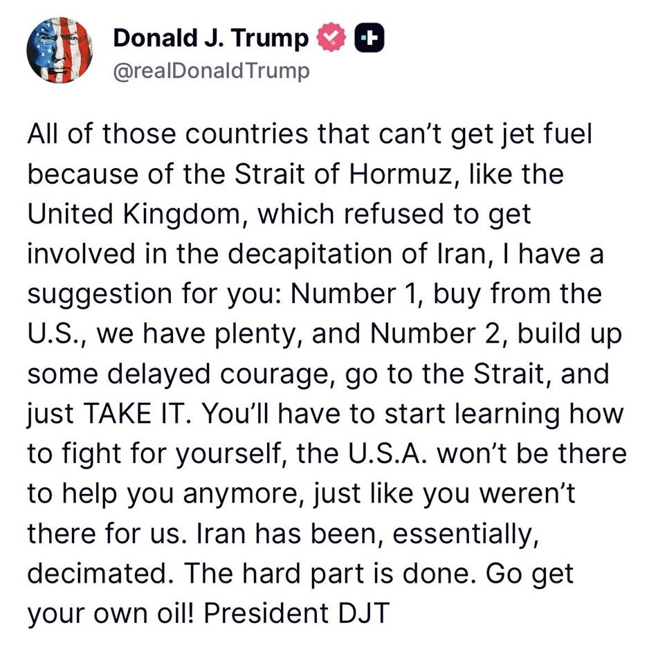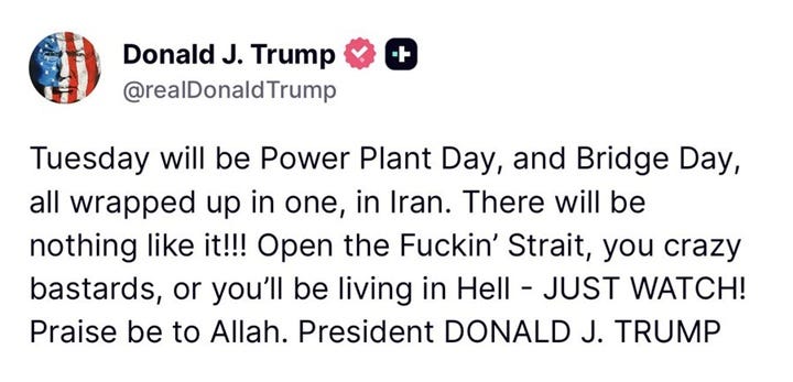 I hate to say “I told you so” — not because saying “I told you so” is unseemly but because the fact that I have to say it means I’m probably living in a world where things have gone badly. I didn’t want to live in a world where gasoline costs over $4 a gallon. I didn’t want to live in a world where America tore up nearly all of its long-standing alliances and threatened to invade and conquer parts of Europe. I didn’t want to live in a world where China is viewed more favorably than the U.S. I didn’t want to live in a world in which the President of the United States posts things like this to his social media account: I didn’t want to live in this world, but my countrymen forced me to live in it. I wrote many, many posts urging people to vote for Kamala Harris, despite all her shortcomings. They did not. And now I have to live with the consequences of my failure, and the failure of my fellow-travelers, to persuade the American people to avoid shooting themselves in the foot back in November 2024. Whatever smugness I get from being able to say “I told you so” is vastly, infinitely outweighed by the dismay I feel over seeing my warnings be vindicated in real time. And I also admit that my warnings were not entirely prescient when it came to Trump. I foresaw that Trump would attack America’s institutions, implementing rule-by-decree, purging competent people in favor of cronies, flouting the law, and wielding the power of the presidency to harass and intimidate his critics. I foresaw that Trump would send ICE into American communities to do violence and harass peaceable Americans. I foresaw that Trump would realign America toward Russia, cut off aid to Ukraine, and try to bully Ukraine into surrendering territory. But I did not actually foresee his biggest mistakes. I didn’t predict that his tariff policy would be nearly as insane as it was — declaring sky-high tariffs on dozens of countries at once, and then selectively walking them back, and then repeating the process again and again. And I did not foresee the Iran war. I never bought into his antiwar campaign stances — he has always been a bully, and he has always been enamored of the idea of military toughness. But I saw Trump, fundamentally, as a coward — someone who would launch the occasional air strike, but would be too intimidated by the prospect of a military defeat to launch a major war. I saw his cowardice as the core of truth behind the cynical promises of geopolitical isolationism and restraint. So I can’t quite say “I told you so” in this case. I knew Trump was very bad news, but I didn’t realize quite how multidimensionally bad. I suppose even after all the Trump-bashing I did, I have to issue a mea culpa. I anticipated that Trump would be chaotic, dictatorial, and cruel, but I failed to anticipate how stupid he would be. Even when the Iran war started, I thought that Trump would probably back off and chicken out pretty quickly. But as with his denial of the 2020 election result, he appears to have stumbled into a losing effort that he feels he can’t back out of. Unlike with Trump’s limited strikes on Iran in early 2025, or his killing of Qasem Soleimani in 2020, Iran has not simply taken its lumps with grace. With the decapitation of its leaders and Israel pressing for regime change, Iran’s leadership was on what Sarah M. Paine calls “death ground” — they had no choice but to resist with everything they had. And so they’ve continued to fire drones and missiles from underground launchers at a diminished but steady pace. These strikes have occasionally hit valuable U.S. military assets, taking out an AWACS plane (one of only 16 the U.S. has) and some THAAD missile defense radars, and reportedly making several U.S. military bases too dangerous to use. But the Iranians’ most damaging attack, by far, was to close the Strait of Hormuz, sending global oil, gas, and fuel prices soaring. This is hurting American consumers and tanking Trump’s popularity, but it’s hurting other countries around the world — who don’t have their own shale gas and shale oil reserves to weather the shock — even more.¹ The Iran war has put Trump in a no-win situation. He’s clearly losing a war against a far inferior power. If he stays in the war, and the Strait of Hormuz stays closed, then he keeps losing; if he withdraws, he lost and it’s over. And even if he chickens out as usual, there’s no reason to think Iran will simply open the Strait; now that they see that they can bring Trump’s America to its knees with their oil weapon, they’ll probably use it to extract more concessions. This is why Trump is writhing in the grip of his own bad decisions, looking desperately for a way out. He reduced oil sanctions on Iran, basically begging them to open the Strait, but they didn’t; instead, Iran just gets to sell more oil and make more money. He has repeatedly declared victory in the war, hoping that everyone will just agree that he won, allowing him to quit gracefully — but no one thinks he actually w |