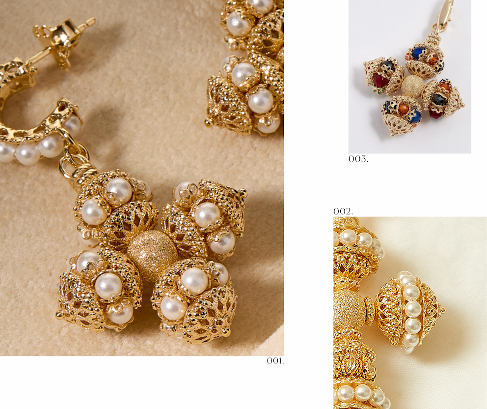 Our Santina Earrings are beautifully detailed, featuring statement cross silhouettes adorned with Swarovski pearls, sandblasted gold and delicate filigree for a soft, radiant finish. For something lighter, the Mini Santina Earrings offer the same signature detailing in a more effortless hoop style with a dangling cross charm.