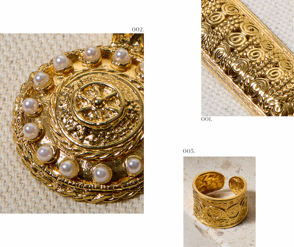 The Treasures Laran Pendant Necklace, embellished with pearls and a protective shield motif, makes a striking statement, while the Pandora Earrings and Pandora Ring showcase delicate filigree and traditional etchings in gold-plated silver.