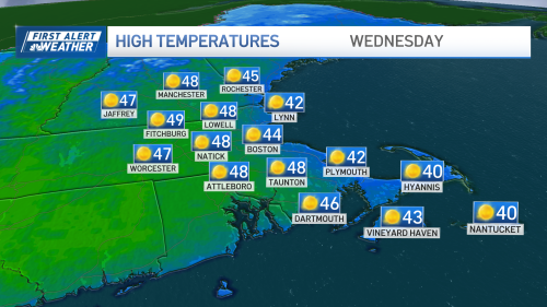 There’s no snow today, but we’re still on the chilly side. Bold April sunshine will dominate the sky, but cool air will sweep in from the ocean, capping our high temperatures in the low 40s at the coast and upper 40s away. Tonight sees us plunge back to the upper 20s to low 30s under a clear sky. Tomorrow will mark the turnaround as high temperatures push through the 50s with only a light sea breeze expected later in the day. Still a ton of sun around, too. |