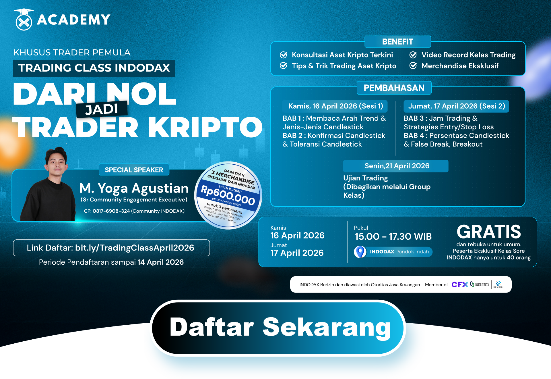 Jadi tunggu apa lagi, buruan daftarkan diri kalian di class  ini, eksklusif hanya 40 peserta untuk Offline class, dapatkan kesempatan untuk mendapatkan merchandise eksklusif dari INDODAX! Periode pendaftaran Trading Class INDODAX ini dibuka hingga 14 April 2026.