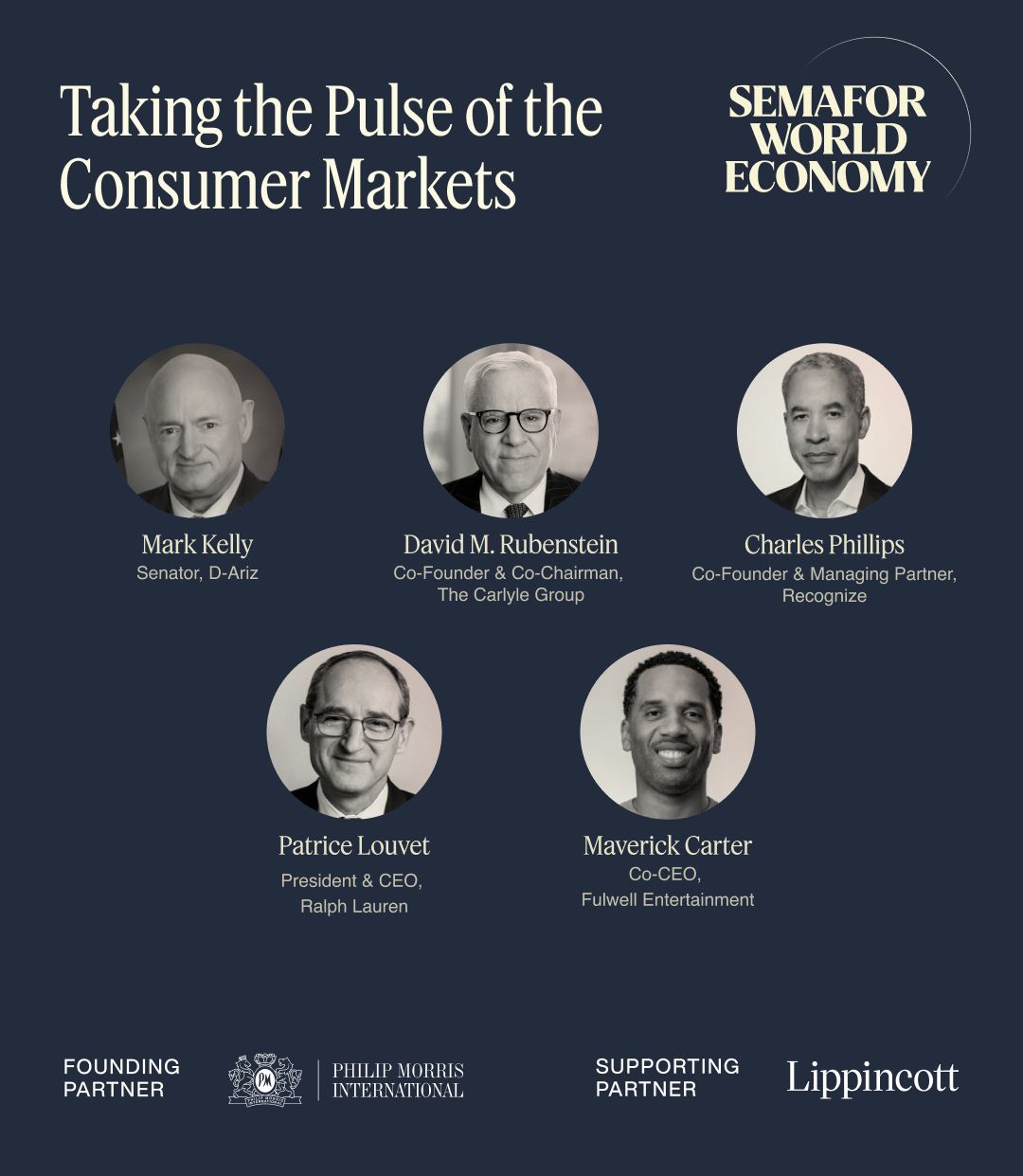 Mark Kelly, Senator, D-Ariz.; David Rubenstein, Co-Founder & Co-Chairman, The Carlyle Group; Charles Phillips, Co-Founder & Managing Partner, Recognize; Patrice Louvet, President & CEO, Ralph Lauren; Maverick Carter, Co-CEO, Fulwell Entertainment; and more will join the Taking the Pulse of the Consumer Markets session at Semafor World Economy. This session will examine how businesses are identifying what is strengthening or fracturing among consumers, and what early insights are indicating about future growth. April 15, 2026 | Washington, DC | Apply to attend |