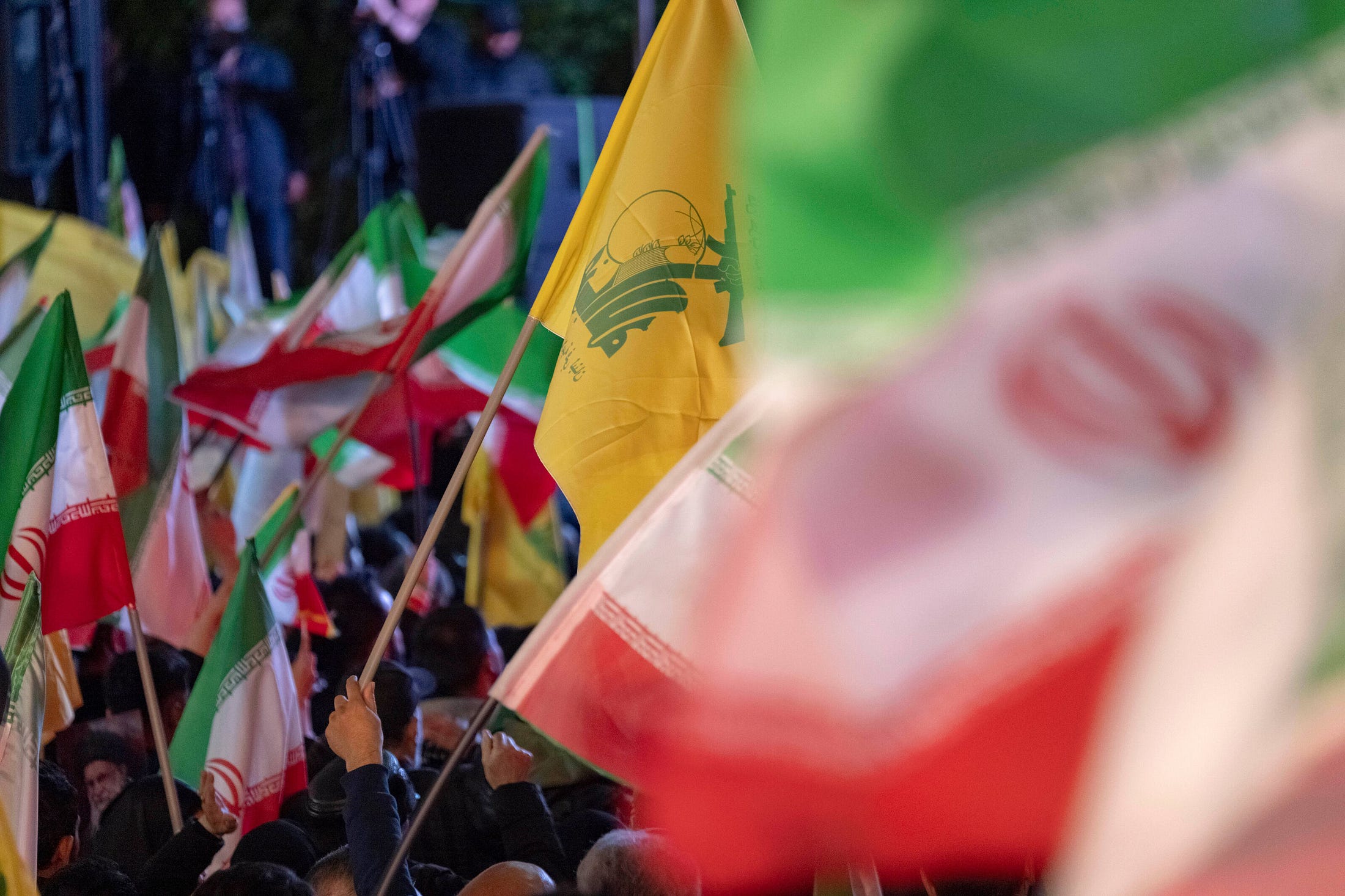 Pro-government demonstrators wave Iranian and Hezbollah flags during the funeral of IRGC intelligence chief Majid Khademi in Tehran, Iran, on April 8. (Morteza Nikoubazl via AP)