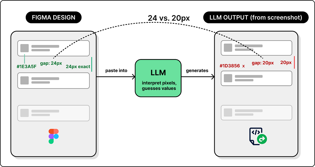 Are your AI investments paying off? (Sponsored)AI budgets are under the microscope and most engineering teams only cite time savings from code generation when asked if it’s working. The real impact is in production, where teams spend 70% of engineering time investigating incidents, jumping between tools, and losing time that could go toward shipping product. That operational load only grows with every line of AI-generated code that hits prod. Learn how engineering teams at Coinbase, Zscaler, and Salesforce are seeing AI impact across the full engineering lifecycle. Plus, get a practical worksheet for modeling AI ROI with your own operational data. Turning a design into working code is one of the most common tasks in frontend development, and one of the hardest to automate. The design lives in Figma. The code lives in a repository. Bridging the two has traditionally required a developer to manually interpret layouts, colors, spacing, and component structure from a visual reference. AI coding agents promise to close that gap, but the naive approaches fall short in important ways. Figma launched its MCP server in June 2025 to bring design context into code. This year, they released two new workflows: the ability to generate designs from coding tools like Claude Code and Codex, and the ability for agents to write directly to Figma design. We spoke with Emil Sjölander, Aditya Muttur, and Shannon Toliver from the Figma team behind these releases to understand the details and engineering challenges. This article covers how Figma’s design-to-code and code-to-design workflows actually work, starting with why the obvious approaches fail, how MCP solves them, and the engineering challenges that remain. The Gap Between Design and CodeBefore diving into how Figma’s MCP server works, it helps to understand the approaches that came before it, and why each one hits a wall. There are two natural ways to give an LLM access to a design: show it a picture, or hand it the raw data. Both have fundamental limitations that motivated a different approach. Approach 1: Screenshot the designThe most obvious way to turn a design into code with an LLM is to take a screenshot of your Figma file and paste it into a coding agent. The LLM sees the image, interprets the layout, and generates code. This works for simple UIs. But it breaks down for anything complex. The LLM has to guess values based on pixels. It doesn’t know the exact color or that the spacing between cards is 24px, not 20px. The output may look close, but not identical. So screenshots give the LLM a visual reference but no precise values. The next natural step is to go in the opposite direction: give it all the data. Approach 2: Get Design JSON via Figma’s APIFigma exposes a REST API that returns a file’s entire structure as JSON. Every node, property, and style is included. Now the LLM has real data instead of pixels. But having all the data introduces its own problem: there is far too much of it. A single Figma page can produce thousands of lines of JSON, filled with pixel coordinates, visual effects, internal layout rules, and other metadata that are not useful for code generation. Dumping all of this into a prompt can exceed the context window. Even when it fits, the LLM has to wade through pixel coordinates, blend modes, export settings, and other visual metadata that have nothing to do with building a UI, which degrades the output quality. |