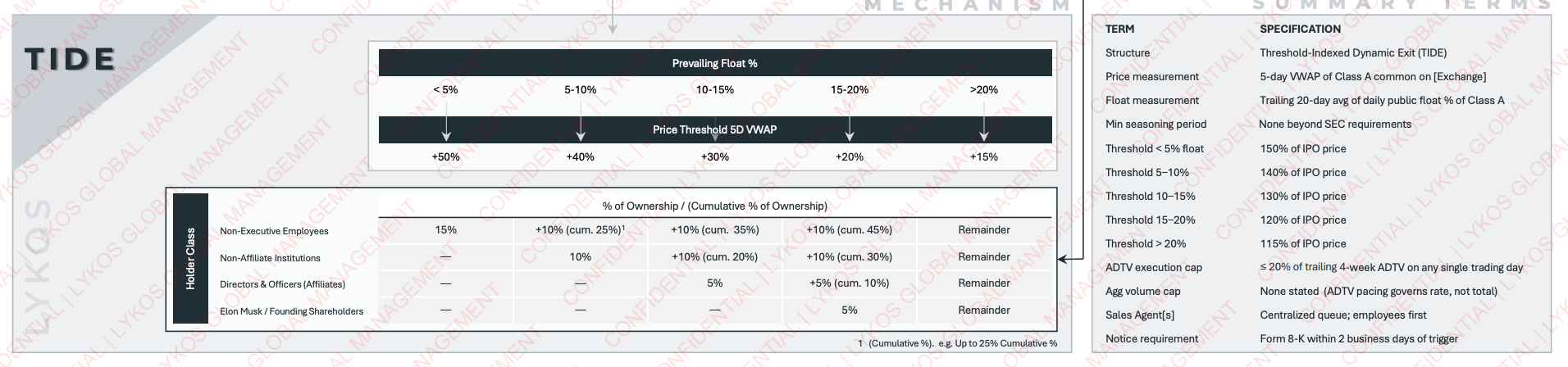 Lykos Global Management presentation, reviewed by SemaforBankers have been puzzling over how to handle the tsunami of selling that would hit the market six months after the SpaceX IPO, if the company pursued a traditional insider “lock-up.” They are considering ways to have those shares trickle into the market sooner and more slowly, assuming the demand is there. A document prepared by hedge fund Lykos Global Management that was seen by Semafor and shared with some of SpaceX’s underwriters pitches a new IPO structure and games out how it would work for a company SpaceX’s size, though it’s unclear whether SpaceX is considering this structure. If SpaceX’s stock price trades at a five-day average that’s 50% higher than the IPO price, the first gate would lift, allowing employees to sell 15% of their stock, according to Lykos’ presentation. After that, the price thresholds decrease because the market is deeper and can more easily absorb new shares without wild swings. Directors at the company are let out later, then finally CEO Elon Musk, though whether he wants to sell remains an open question. The process — dubbed the Threshold-Indexed Dynamic Exit, or TIDE — is cheekily named to fix the problem it solves: the wave of selling that follows big IPOs and can weigh on the stock price. It’s essentially a rolling IPO, calibrated to the market’s ability to smoothly absorb the largest chunk of stock ever thrown its way. |