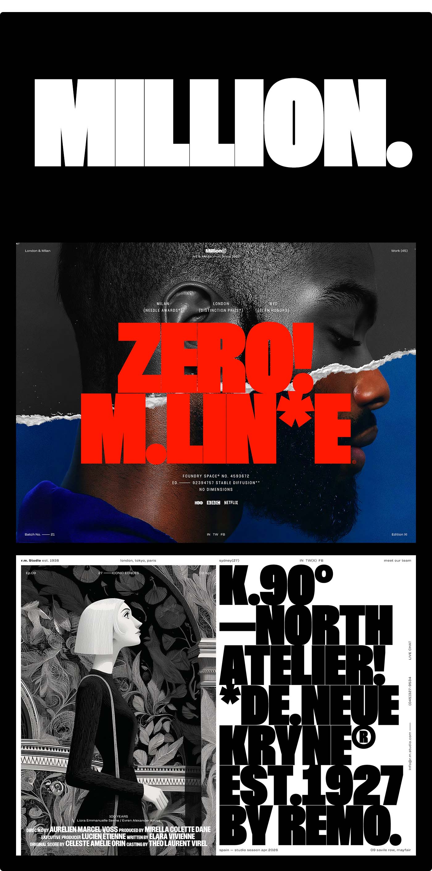 Introducing — MILLION is a condensed display typeface built for dominance. Designed to hit hard at large sizes, it drives dense vertical force, and a relentless attitude. With 18 styles across 9 weights —giving designers control over hierarchy without sacrificing impact.