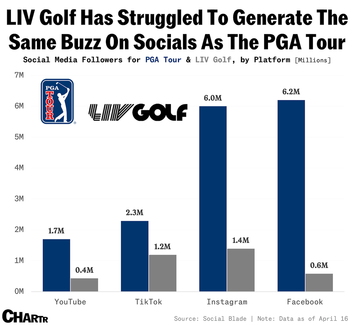 Despite bumper signing bonuses, prize pots, and contracts that lured the likes of Dustin Johnson, Phil Mickelson, and Jon Rahm, LIV never made the online splash that the Saudi Kingdom’s financial managers likely hoped for. Even on YouTube, where tournaments can be livestreamed for free in many markets, the LIV Golf channel has racked up just 437,000 subscribers — arguably not a great return on a $5 billion investment. |