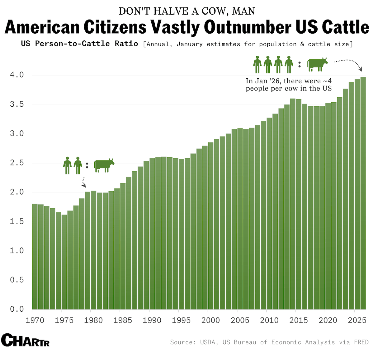 When compared with the human population in the US, the nation’s ratio of people-to-cattle has effectively doubled from 1980 (when cattle headcount was ~111.2 million) to 4-to-1 at the start of 2026.