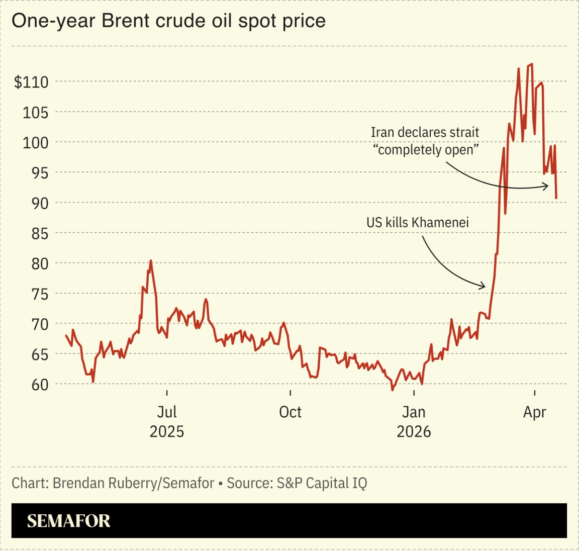 The definition of “open,” when it comes to the Strait of Hormuz, is up for debate. This morning markets reacted with exuberance to a post by Iran’s foreign minister on X that the Strait of Hormuz was “completely open,” with oil prices falling about 10% within two hours, and the S&P 500 crossed 7100 for the first time. But after markets closed, The Wall Street Journal reported Tehran intends to limit ship volume and charge tolls during the ceasefire. Earlier today, the US reportedly proposed a uranium-for-cash deal that would give Tehran access to $20 billion, if they give up their fissile material. Meanwhile, leaders of Hezbollah made a “cautious commitment” to honor the terms of a 10-day ceasefire negotiated between Lebanon and Israel, buying time for an even more complicated challenge of turning the temporary truce into a lasting peace.
