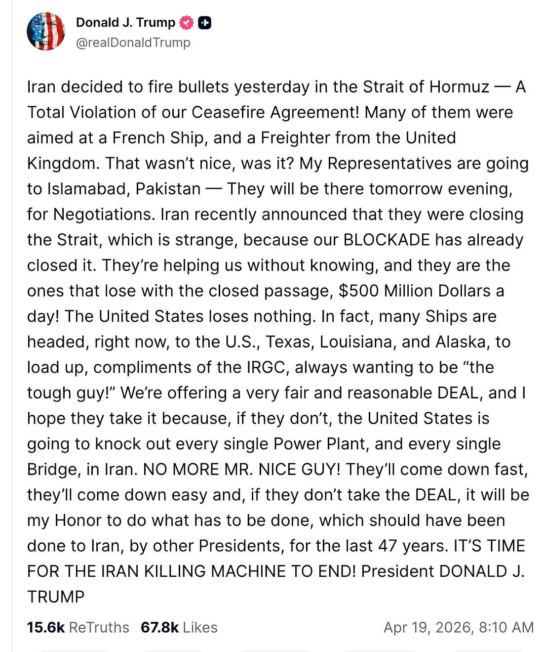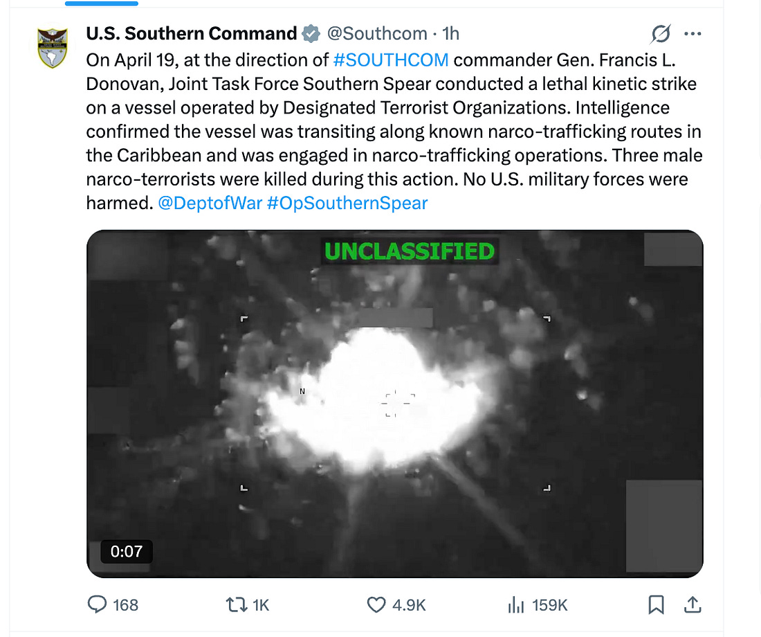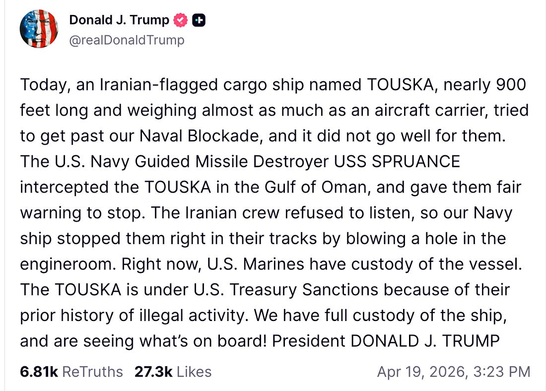 We seem doomed to another week of war news. On Sunday, Trump announced on Truth Social that the U.S. military seized an Iranian-flagged ship that he said tried to run the U.S. blockade in the Strait of Hormuz. Marines boarded the cargo ship Touska after it was disabled. Trump posted that the USS Spruance “gave them fair warning to stop,” but that “The Iranian crew refused to listen, so our Navy ship stopped them right in their tracks by blowing a hole in the engineroom.” But what’s happening with the president as he conducts his war is now completely out of bounds. This morning, just after 8 a.m., he had a long rambling post on Truth Social that concluded, “if they don’t, the United States is going to knock out every single Power Plant, and every single Bridge, in Iran. NO MORE MR. NICE GUY!” Notice how Trump speaks in the language of an all-powerful businessman, a CEO without a board to tell him what to do. He is sending “My Representatives” to Pakistan and “if they (Iran) don’t take the DEAL,” he’ll do “what has to be done.” It’s crazy on steroids, and well past the point where even his own party should be giving him a pass. The president of the United States is threatening to bomb civilian targets and devastate a civilian population. War crimes, plain and simple. All of this from the candidate who, in November of 2024, in the closing days of his campaign for the White House, said that “If Kamala wins, only death and destruction await because she is the candidate of endless wars. I am the candidate of peace.” Every accusation is a confession. And the Truth Social posts happened after Trump called NATO and our allies “absolutely useless” at a Turning Point USA event Friday night. If you’re exhausted, and honestly, at this point, who isn’t, take a deep breath, plan for a little extra fellowship with friends (more on my plans at the end), and remind yourself that we cannot afford to put our heads in the sand and that the effort to overwhelm us in intentional—that’s how authoritarians do it. It’s a good week to talk with people about what’s going on, to encourage them to stop and think, and then to make sure they’re registered to vote. The U.S. Ambassador to the U.N., Mike Waltz, was on ABC’s “This Week,” Sunday morning, and he chimed right in with the president. Host John Karl asked if Trump was prepared to go back to “full-on war” and Waltz responded, “all options are on the table. We could take that infrastructure out relatively easily. The Iranian air defenses have been absolutely decimated.” He continued, without being prompted, “And just to get ahead of a lot of the critics and hand-wringing, throwing out irresponsible terms like ‘war crimes’, attacking, destroying infrastructure that has clearly and historically been used for dual military purposes is not a war crime.” Then Waltz did it again on NBC’s “Meet the Press,” where volunteering to Kristen Welker, who hadn’t asked about it, that the U.S. could still target civilian infrastructure in Iran if a ceasefire deal wasn’t reached, again claiming that wouldn’t amount to war crimes. “We have a long history of taking down bridges, power plants and other infrastructure that is powering Iran’s military,” Waltz said, as though that somehow made it acceptable. “In the laws of land warfare and the rules of engagement, any type of infrastructure that is co-mingled is absolutely a legitimate target.” He reiterated on CBS, appearing on “Face the Nation,” that because the IRGC is running bridges and power plants, they are “legitimate military targets,” again rejecting the notions that bombing them would be “some type of war crime.” So bombing civilian targets seems to be top of mind for the president and one of his key spokespeople on these issues, which should concern all of us. Waltz is a former Army Special Forces Officer, decorated for his bravery. He graduated from Virginia Military Academy, according to his bio from his time in Congress, but he is not a lawyer. Apparently, concerns about launching attacks against civilian populations didn’t stick. Waltz was Trump’s first National Security Advisor this term, but he resigned following Signalgate after serving for just 101 days. (Tonight’s trivia: That’s the second shortest tenure of any NSA. Mike Flynn, who was Trump’s first NSA in 2017, resigned after just 24 days, two Scaramuccis, and was ultimately convicted of lying to the FBI before Trump pardoned him.) Trump nominated Waltz to serve as the U.N. Ambassador the same day he stepped down. Today, the United States struck yet another vessel in the Caribbean. Three people were killed. The U.S. Southern Command account on Twitter said they were narco-terrorists. These attacks used to be shocking. Now, they barely garner notice. As of the last strike, four days ago, Reuters reported the death toll was “over 170.” Three people were killed in that strike last Wednesday, as well. Also appearing on the Sunday shows, FBI Director Kash Patel said he would file a defamation case on Monday against The Atlantic, which |