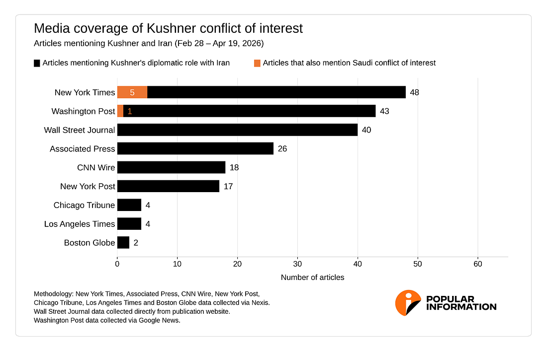 Welcome to Popular Information, a newsletter dedicated to accountability journalism. No corporate overlords. No B.S. The media blackout of Jared Kushner’s historic, ongoing corruption scandalAs Trump's son-in-law returns to Pakistan for more talks with Iran, major news outlets are largely ignoring an egregious conflict of interest.Jared Kushner, President Trump’s son-in-law, is leading U.S. diplomatic efforts with Iran while engaged in a lucrative, ongoing, multi-billion-dollar business relationship with the Saudi government. This brazenly corrupt arrangement is being completely ignored by most major media outlets. In 2021, Kushner raised $2 billion from the Saudi government’s Public Investment Fund (PIF) for his private equity fund, Affinity Partners. Since that time, Kushner has collected more than $110 million in management fees from the Saudi government, according to calculations by Senator Ron Wyden (D-OR) and Congressman Robert Garcia (D-CA). Even as he has assumed a central diplomatic role in negotiations with Iran, Kushner has reportedly sought billions more from the Saudis. Accepting payments from a foreign government while leading diplomacy for the U.S. would be a glaring conflict of interest under any circumstances. But in this case, Kushner was on the Saudi payroll as Saudi Crown Prince Mohammed bin Salman (MBS), the de facto ruler of the country, reportedly lobbied Trump both to initiate and continue the war. Popular Information analyzed coverage of Kushner’s diplomatic role from the outset of the war with Iran on February 28 to April 19. During that period, 202 articles mentioning Kushner’s role representing the U.S. in negotiations with Iran were collectively published by The New York Times, The Washington Post, The Wall Street Journal, The Associated Press, CNN Wire, The New York Post, The Chicago Tribune, The Boston Globe, and The Los Angeles Times. Only six of the 202 articles covering Kushner’s diplomatic role mentioned his financial conflict of interest with the Saudi government. That means more than 97% of the coverage ignored Kushner’s conflict. Of the six articles that covered the conflict, five appeared in the New York Times. The other article originally appeared in Foreign Policy and was republished by the Washington Post. The Wall Street Journal, The Associated Press, CNN Wire, The New York Post, The Chicago Tribune, The Boston Globe, and The Los Angeles Times collectively published dozens of articles about Kushner’s diplomatic role in the war with Iran but never mentioned the conflict. Among the publications analyzed, The New York Times has had the most substantive coverage of Kushner’s conflict. Still, the vast majority of the New York Times coverage of Kushner’s diplomatic role does not even briefly mention his financial conflict. Notably, some publications that have completely ignored Kushner’s conflict produced the reporting that established the factual predicate. For example, The Wall Street Journal produced the foundational reporting on how Kushner raised billions from foreign governments to fund Affinity Partners, including $2 billion from the Saudis. The Washington Post, meanwhile, broke the story on MBS lobbying Trump to initiate the war in Iran, but did not mention Kushner’s financial relationship with the Saudis — even though MBS controls the Saudi PIF. Kushner is expected to return to Pakistan today for further talks with the Iranians. Will the news media continue to ignore or downplay his financial conflict? The Congressional investigationAs the media largely ignores the Kushner corruption scandal, Congressman Jamie Raskin (D-MD), the ranking member of the House Judiciary Committee, just launched an extensive investigation. In an April 16 letter to Kushner, Raskin writes, “your decision to act in these two roles—one public for the government and one private for personal profit—creates a glaring and incurable conflict of interest.” Raskin argues that MBS’s “desire to prolong the war imposes obvious financial pressure on you to prolong this war of choice, risking further harm to American servicemembers, deepening the military morass and draining tens of billions from American taxpayer dollars each week on behalf of your investor and benefactor.” Raskin argues that Kushner “cannot faithfully represent the United States with billions of dollars in Saudi and Emirati cash burning a hole in every pocket of every suit you own.” Raskin informs Kushner that the investigation seeks “information critical to reforming our bribery laws, conflict of interest provisions, other statutes and rules governing the conduct of government and special government employees, and [the Foreign Agents Registration Act].” The letter demands Kushner supply detailed information including, “[a]ll communications between you and any Saudi official, intermediary, or agent— including state-linked investment funds or businesses—between January 2022 and the present day” and “[a]ll communications with the White House and Trump campaign, including your father-in-law, regarding your role within the government from July 1, 2024, to the present day.” Should Democrats retake control of the House next year, the investigation could gain more teeth, as Raskin would become chairman and have the ability to issue sub |