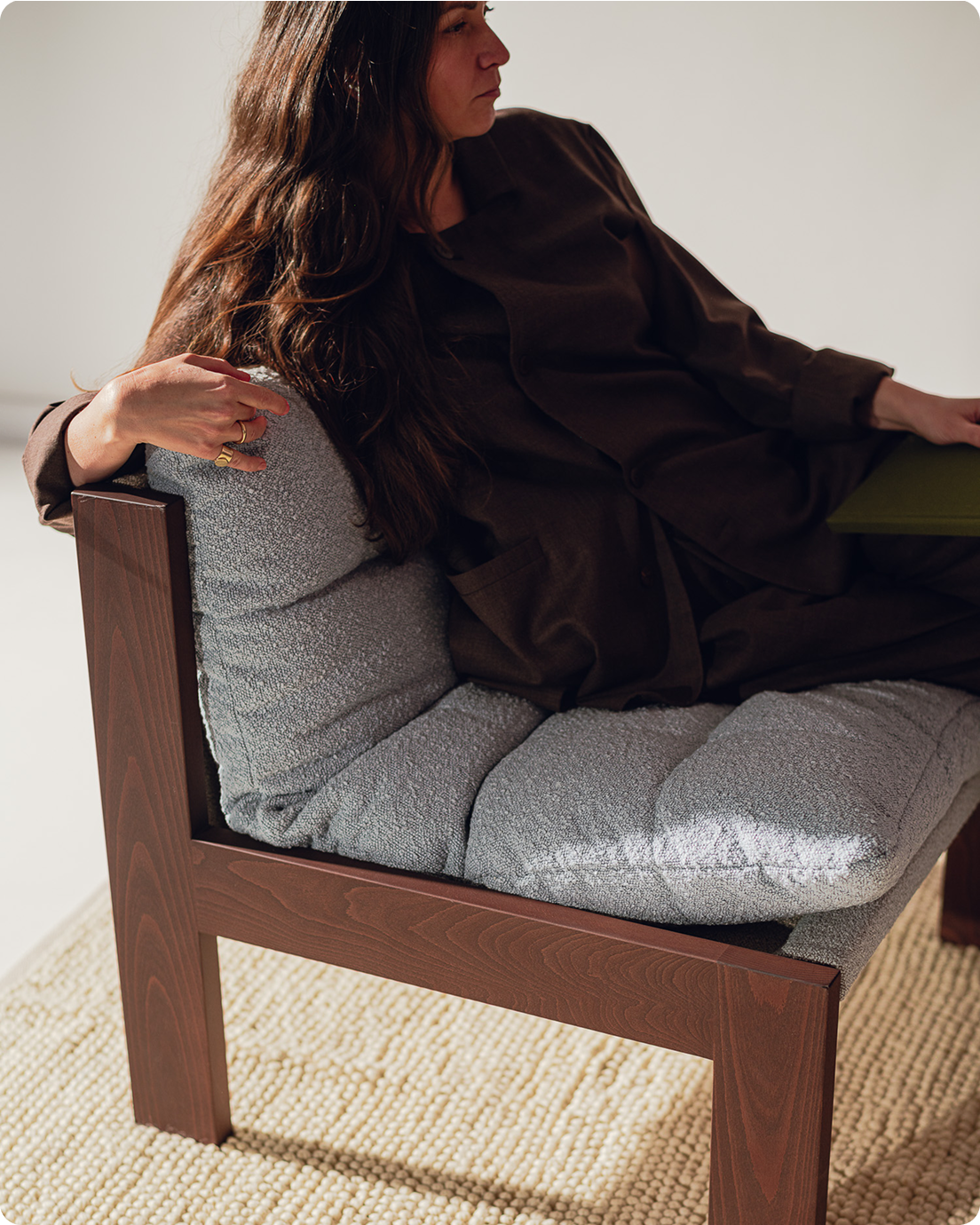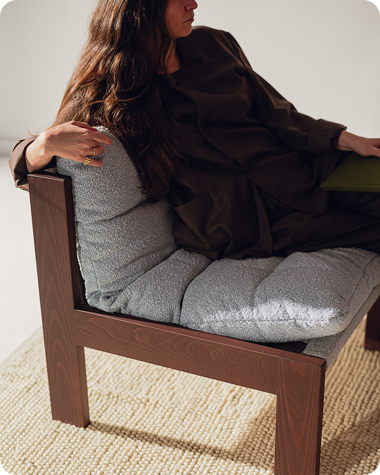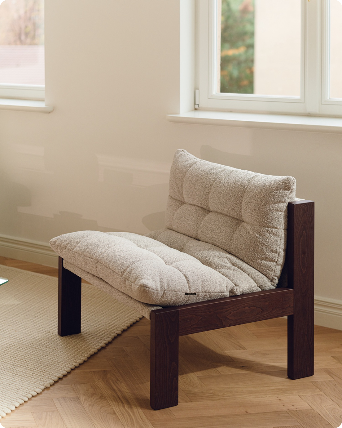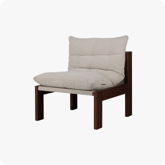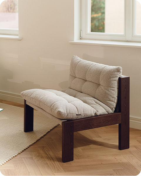 A soft, inviting piece designed to create a refined yet comfortable mood in the interior. Its plush bouclé seat is set within a solid wooden frame, creating a design that feels both distinctive and inviting. Versatile in character, Huno complements a wide range of interiors.