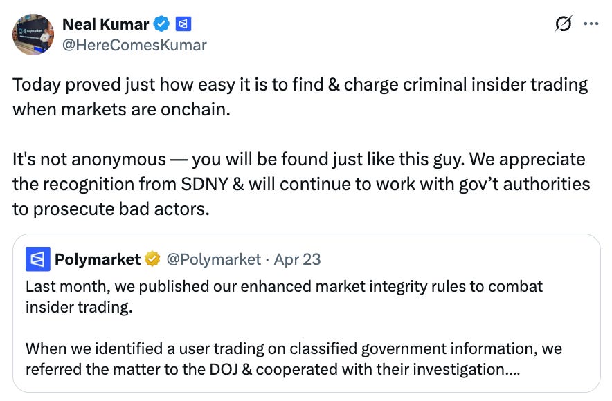 We are living in an information oligarchy. Trump-friendly billionaires control major TV networks, newspapers, and social media platforms. Is it any surprise that powerful corporations and individuals get so much less media scrutiny than they deserve? Popular Information fills this void with people-powered, accountability journalism — unbought and unbossed. There is so much more to do, which is why we are planning our most ambitious reporting ever this year. You will see us dig deeper into the money corrupting our political system, expose the corporations undermining democracy, and break stories that the corporate press won’t touch. You can help make this work possible by upgrading to a paid subscription for $50 per year or $6 per month. Last week, the Justice Department indicted Master Sgt. Gannon Ken Van Dyke for misappropriating classified information to profit on the prediction market Polymarket. Van Dyke was a member of the U.S. Army Special Forces unit that captured former President of Venezuela Nicolás Maduro on January 3, 2026. Over the span of eight days just before the operation, Van Dyke allegedly leveraged his access to classified information to make more than $400,000 on Polymarket. According to the prediction market industry and its advocates in the Trump administration, Van Dyke’s arrest is proof that the “system works.” In reality, Van Dyke’s experience is highly unusual. Van Dyke was not caught because of a robust system that protects prediction markets against insider trading. Rather, it was a combination of the specific kind of information that Van Dyke exploited and his own hamhandedness. Van Dyke allegedly became aware of Maduro’s impending capture around December 8, 2025, when he was assigned to the team planning the operation. According to the indictment, on December 26, 2025, Van Dyke personally created an account on Polymarket, funded it with about $35,000, and began placing bets on Maduro-related markets under the username “Burdensome-Mix.” For example, Van Dyke allegedly placed large “YES” bets on “Maduro out by… January 31, 2026” and “Will the U.S. invade Venezuela by… January 31,” among others. Van Dyke made these bets, according to the indictment, after he signed non-disclosure agreements in which he promised “to never divulge, publish, or reveal by writing, words, conduct, or otherwise . . . any classified or sensitive information.” Polymarket claimed this was a validation of the integrity of its platform. Neal Kumar, Polymarket’s Chief Legal Officer, posted on X that Van Dyke’s arrest “proved just how easy it is to find & charge criminal insider trading when markets are onchain.” A separate X post by the official Polymarket account says it was the company that “identified a user trading on classified information.” Kumar said that others who tried to trade on insider information “will be found just like this guy.” Polymarket CEO Shayne Coplan posted: “We flagged this, referred it, and cooperated throughout the process.” Polymarket’s story does not add up. The indictment credits “reports of unusual trading in Maduro-related contracts on Polymarket [that] appeared in the press and on social media” with bringing scrutiny to Van Dyke’s conduct. Polymarket’s internal systems are not mentioned. The issue was that, according to the indictment, Van Dyke did not take basic steps to conceal his activity. He opened brand-new accounts to place trades and immediately placed large bets on a narrow range of contracts, all related to Maduro. Had Van Dyke spread smaller bets across several accounts with established betting histories, his conduct would have been difficult or impossible to detect. An even more effective tactic would have been to pass the information to a third party who would execute that strategy. Van Dyke allegedly took none of these precautions. Further, all the charges in the indictment rest on the fact that the information used by Van Dyke was classified and that he had a duty not to disclose or misuse it. Many of the markets offered by Polymarket do not involve this kind of information. For example, Polymarket is currently taking bets on whether Clavicular, a “looksmaxxing” online influencer, “announces that he and a partner are expecting a baby through pregnancy between market creation and December 31, 2026.” Clavicular has no obligation to keep the timing of any potential pregnancy announcement secret. Similarly, if Clavicular informed a friend in advance of an announcement, the friend would have no “duty” not to share or act on that information. In other words, the roadmap for prosecuting Van Dyke would not apply to insiders gaming the Clavicular market — or the vast majority of markets offered on Polymarket and Kalshi. Notably, Coplan told 60 Minutes in November 2025 that trading on insider information was beneficial. “I think that people going and having an edge to the market is a good thing,” Coplan said. “Obviously… you need to be really clear and stringent on where the line is drawn… But it’s sort of an inevitability that this will happen, and there’s a lot of benefits from it.” The truth about KalshiKalshi, Polymarket’s chief rival, attempted to use the indictment to portray itself as the prediction market with real protections against insider trading. CNBC reported that Kalshi “blocked Van Dyke from opening a Kalshi account.” Notably, a Kalshi spokesperson “could not give details of when the 38-year-old Van Dyke tried to open an account or why he was prevented from doing so.” |