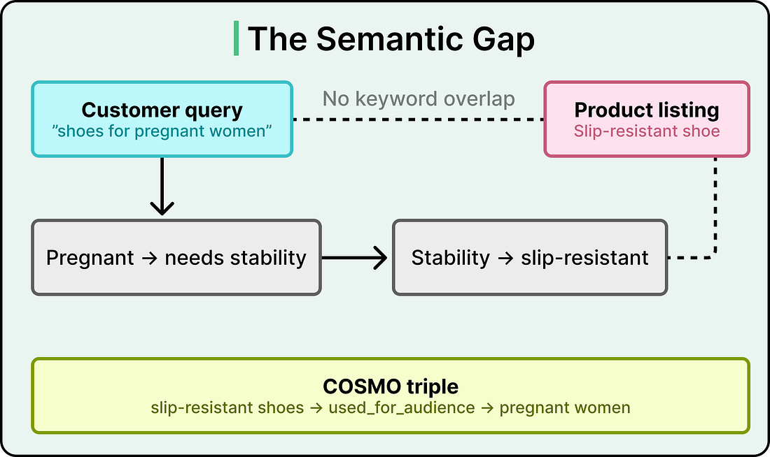 Your agent isn’t broken. Your context is. (Sponsored)Most AI agents don’t fail because the model is bad. They fail because the model doesn’t have the proper infrastructure to reason well. Simba Khadder, Head of Engineering at Redis, lays out a 4 pillar framework for building context systems that hold up in production—plus an architectural self-audit checklist you can run against your stack today. Search “shoes for pregnant women” on Amazon, and the best results you get might be slip-resistant shoes. This is even though the word “pregnant” appears nowhere in those product listings. In other words, there is zero keyword overlap between the query and the product. The search engine has to reason that pregnant women need stability, that stability means slip-resistance, and that slip-resistant shoes are the right match. Traditional recommendation systems match text to text and purchase history to purchase history. They handle keyword overlap quite well. However, when a shopper’s intent requires a reasoning step that lives entirely in human common sense, those systems hit a wall. Amazon’s search team recognized this blind spot and built a commonsense knowledge graph called COSMO that teaches the recommendation engine to think the way a human shopper would. In this article, we will look at how COSMO works and the challenges the engineering team faced. Disclaimer: This post is based on publicly shared details from the Amazon Engineering Team. Please comment if you notice any inaccuracies. The Gap Between What You Search and What You MeanAmazon already operates large-scale knowledge graphs that store factual product attributes like brand, color, material, and category. These graphs power a lot of what works well in product search today. However, they mainly try to encode what a product is, and they don’t explain why a human would want it. This is the semantic gap problem. For example, a query like “winter clothes” carries an implicit intent around warmth. The product catalog for a long-sleeve puffer coat describes its material, size options, and sleeve length, but it may say nothing about warmth directly. The gap between what the customer typed and what the product listing says requires a reasoning step that factual knowledge graphs were never designed to handle. Amazon’s team surveyed the landscape of existing solutions.