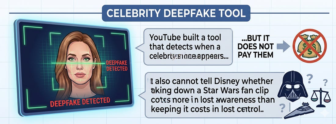 YouTube Built a Tool To Protect Celebrity Likenesses. But It Does Not Pay Them.A win for Google also proves why the Paramount and Warner Bros. Discovery merger will be talent's best bet for getting paid.A core argument of my essays from the past few months is that a studio will need to partner with a cloud provider to protect its intellectual property (IP). Google-owned YouTube recently announced an alternative path to that outcome: A deepfake detection tool for creators which it opened up to politicians and journalists last month, and expanded to actors, athletes, creators and musicians last week. Anyone “at high risk of having their likeness abused” can sign up to identify and request removal of deepfakes on its platform, whether or not they have a YouTube account. The model is the “same concept” as its Content ID system to identify copyrighted content uploaded to its servers. Effectively, a celebrity, creator or public figure is uploading their likeness into Google’s cloud infrastructure, where AI learns to identify—but not produce—those likenesses across all content on the platform. That is an enforcement mechanism that operates at both the cloud-level—where the likenesses are identified—and the platform-level—where the videos with violations are either flagged or removed. This mechanism is “air-gapped”: constrained within the cloud and isolated from other models and the broader internet. That is a double-edged sword. Likenesses can be protected independent of studios, which are slow to partner with cloud companies. However, unlike content ID—where music rightsholders are paid a portion of ad revenue where use of their music was identified—celebrities are not being compensated when their likeness is flagged. They and/or their management team must request the removal manually. But that request for removal “does not guarantee that YouTube will pull the video”, as its community guidelines allow for “a number of cases like parody and satire” to remain on the platform. These are operational costs. The deeper problems are structural. Past essays related to today’s analysis: |