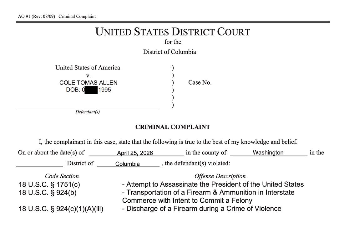 Today, the government charged Cole Thomas Allen with attempt to assassinate the president, interstate transportation of a firearm, and discharging a firearm during a crime of violence. Prosecutors asked a judge in the District of Columbia to detain Allen in custody pending trial. The charges filed against Allen differ from what U.S. Attorney Jeanine Pirro suggested they would be over the weekend, but, as we discussed, that was to be expected, with charging decisions remaining fluid as officials learn new information. A prosecutor indicated that the attempt to assassinate Trump was made with a 12-gauge pump action shotgun, but that Allen was also carrying a .38 caliber semi-automatic pistol, three knives, “and other dangerous paraphernalia.” This is a criminal complaint, issued by a judge based on an agent’s affidavit, attesting to probable cause. The government will almost certainly follow up with a grand jury indictment in the next week or two. If they don’t, the judge will hold a preliminary hearing within 14 days if Allen remains in custody, 21 days if he’s released (which isn’t happening here), to determine whether probable cause exists. Federal prosecutors almost never go this route because it requires them to put their evidence on full display at this early stage in the proceedings, and unlike grand jury proceedings, where the defense doesn’t have a role, it permits cross-examination of the government’s witnesses. Expect a grand jury indictment shortly. The lead charge here is “attempt” to assassinate the president, in violation of 18 U.S.C. 1751, so we need to understand a little bit about that crime and what prosecutors will have to prove. An attempt is referred to as an inchoate, or incomplete crime. With attempt charges, the key questions center around whether the defendant had the intent to commit the underlying crime and whether he took a substantial step—more than mere preparation—toward completing it. Here, based on the details in the government’s affidavit, which we’ll get to in a moment, its case looks solid. Allen evidenced an intent to kill the president. And the government has plenty of evidence to argue he went beyond “mere preparation” and took a substantial step toward committing the offense, since he was armed and running for the door to the ballroom, at the point when he was arrested. The penalties for attempt and for the underlying offense are almost always the same under federal law, and that’s true here, with the statute providing for up to life imprisonment upon conviction. Allen is also charged, as we expected last night, with violating 18 USC 924(c), which prohibits using a firearm “in furtherance of” a crime of violence. It carries a 10-year penalty if the firearm is fired, which is how Allen is charged. The complaint adds in one count of 18 U.S.C. 924(b), which makes it a crime for anyone who intends to commit a felony to transport a firearm across state lines. The punishment for that crime is up to 10 years in prison. In order to get the complaint, the government had to provide the judge with a sworn affidavit from a federal agent. The 7-page affidavit provides some interesting details about the government’s evidence, but contains standard language advising the judge that “This affidavit is intended to show merely that there is sufficient probable cause for the requested complaint and does not set forth all of my knowledge about this matter.” On March 2, President Trump announced he would attend the White House Correspondents’ Dinner, according to the affidavit. Allen then: