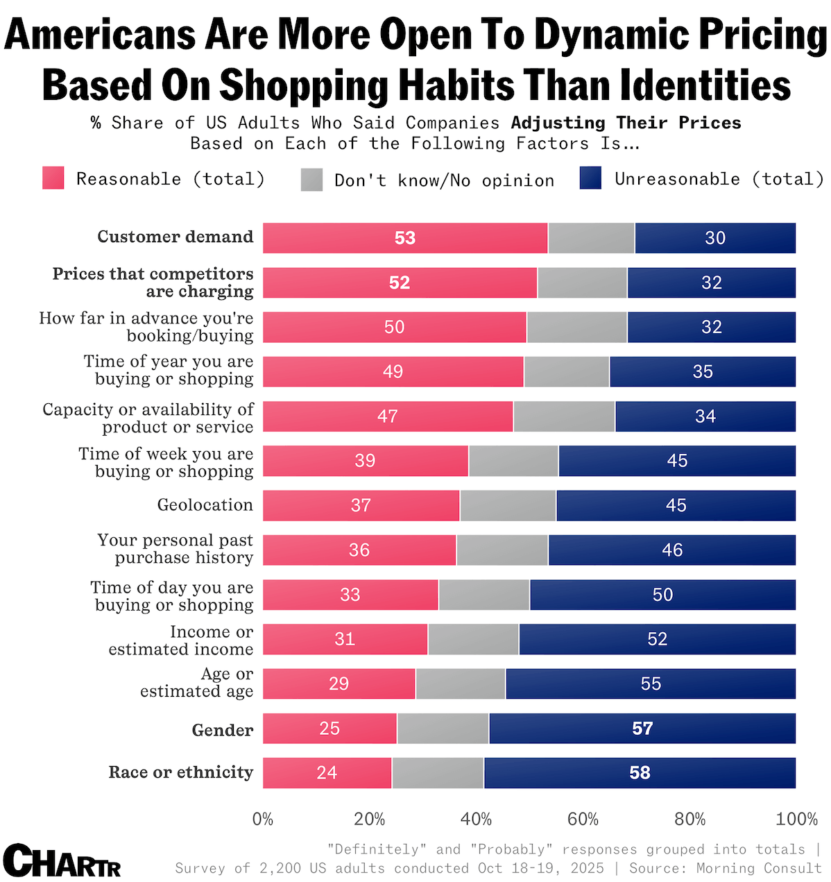 In a recent survey conducted by Morning Consult, at least half of US adults said that inputs that are traditionally factored into fee setting — like customer demand (53%), competitor prices (52%), and how far in advance the purchase is happening (50%) — were reasonable grounds to adjust prices.