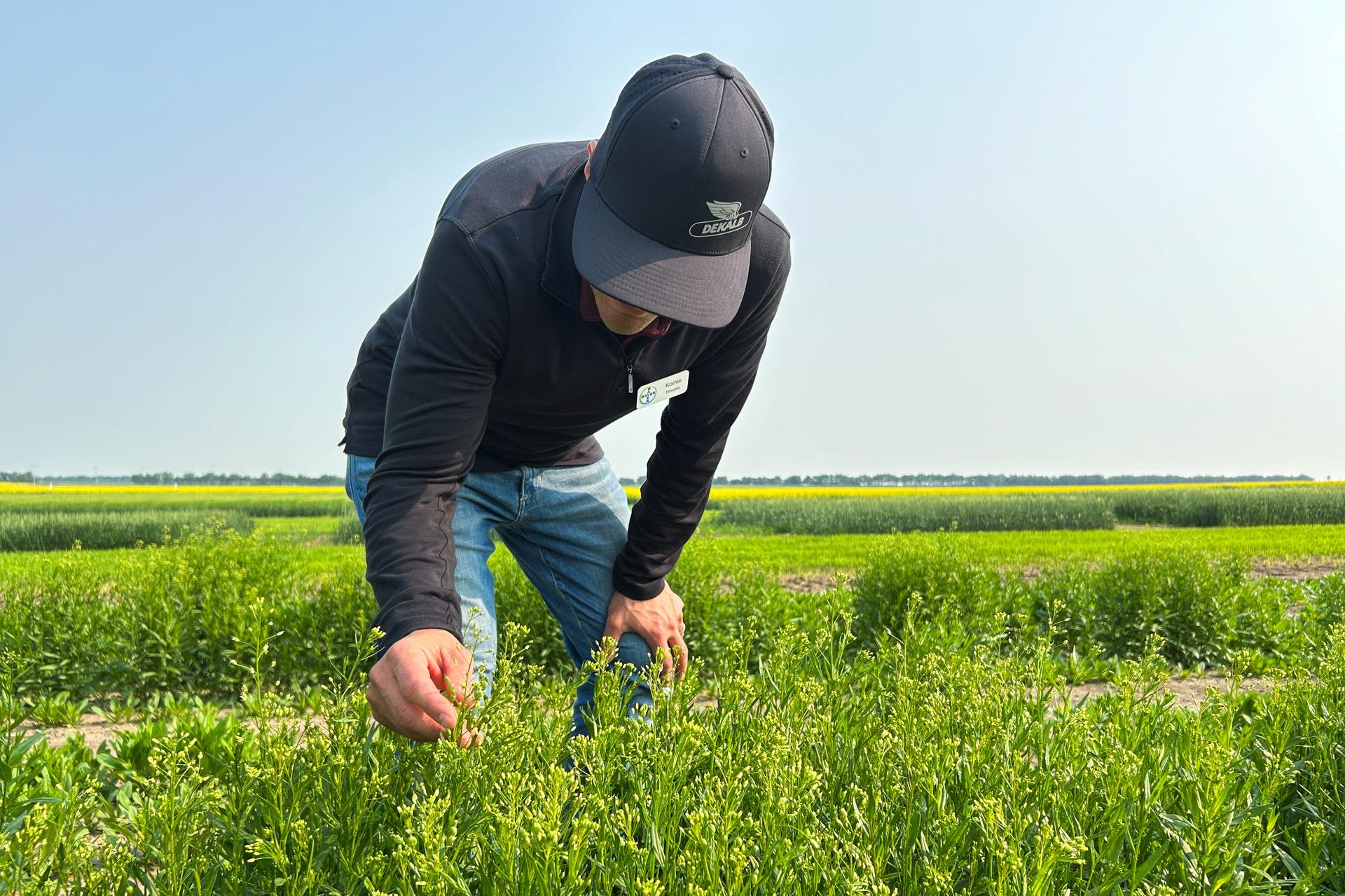 Komie Hossini of Bayer examines test plots of camelina, a drought resistant oilseed, at his company’s research farm near Saskatoon, Saskatchewan, Canada. REUTERS/Ed White