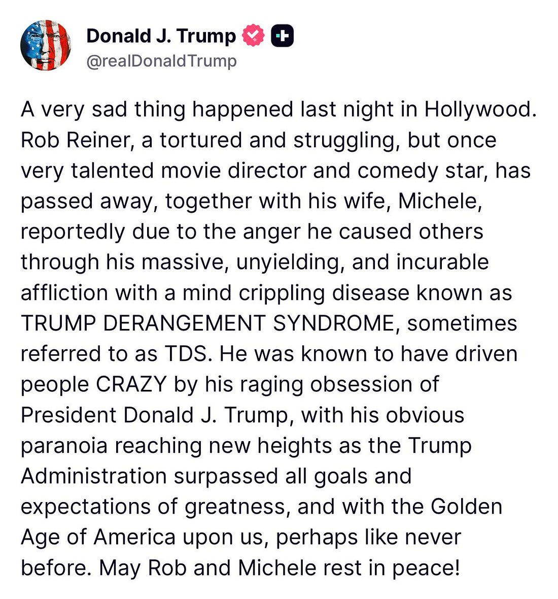 Yesterday we learned that the wonderful movie director and actor Rob Reiner and his wife Michele Singer were murdered in their home. Authorities believe their son is responsible. It’s so incredibly sad. Nick Reiner spoke about how he had been in and out of rehab over a dozen times, and was helped by his parents through it all over the years. Apparently, Nick had argued with his father the night before their muders. It’s just heartbreaking, and hard to know what happened and why. I suppose we’ll find out eventually. It’s been a difficult week. So much hate. And then this: after the news broke about the Reiners’ murders, Trump wrote on social media: It’s actually crazy talk. And then later, he doubled down. We all have unfortunately become accustomed to horrible things from trump, but this hits a new low for me. They are the comments of a narcissistic, cruel human being. In the hours after he said these things, many condemned them, including members of the Republican Party. It was good to read that some members of the GOP have a sense of decency. But I just checked the various mainstream outlets that I read daily, and I see no mention of Trump’s horrific words anymore. Why can’t there be a way to keep pushing back on this horrible behavior? And keep calling him out loudly on how he treats female reporters? Has mainstream media lost its decency? Rob Reiner was a political activist, very vocal in his opinion against Trump. He was angry and not afraid to show it. This morning I thought, wouldn’t it be sweet if Trump’s comments about Reiner’s murder are the thing that really bring him down? That the crudeness of what Trump said, how mean it was, how really crazy the comments were, will be what push people away from him. Trump’s support is eroding, and this certainly added to it. That would have made Reiner happy, I bet. In other news: Hegseth witholds video of boat survivors’ deaths. “Defense Secretary Pete Hegseth refused to share video of a heavily scrutinized Sept. 2 military strike on a suspected drug boat during briefings with Congress on Tuesday. Mr. Hegseth faced calls to share unedited video of the attack, in which a follow-up strike killed two survivors, but said he would play it only for the House and Senate Armed Services committees. Mr. Hegseth added that it would not be made public. The U.S. military attacks have killed at least 95 people.” Unemployment numbers rose today to a four year high, causing worry for the economy. Trump shrugged it off. And the Epstein files have still not been released. I don’t want to draw a cartoon about Trump again today, its too hard. So I leave you with a couple of snow people! I hope you’re holding up okay, it’s been a rough week. Thank you for being here, I’m very grateful for your company. Have a good Tuesday. You're currently a free subscriber to Seeing Things. For the full experience, upgrade your subscription. |