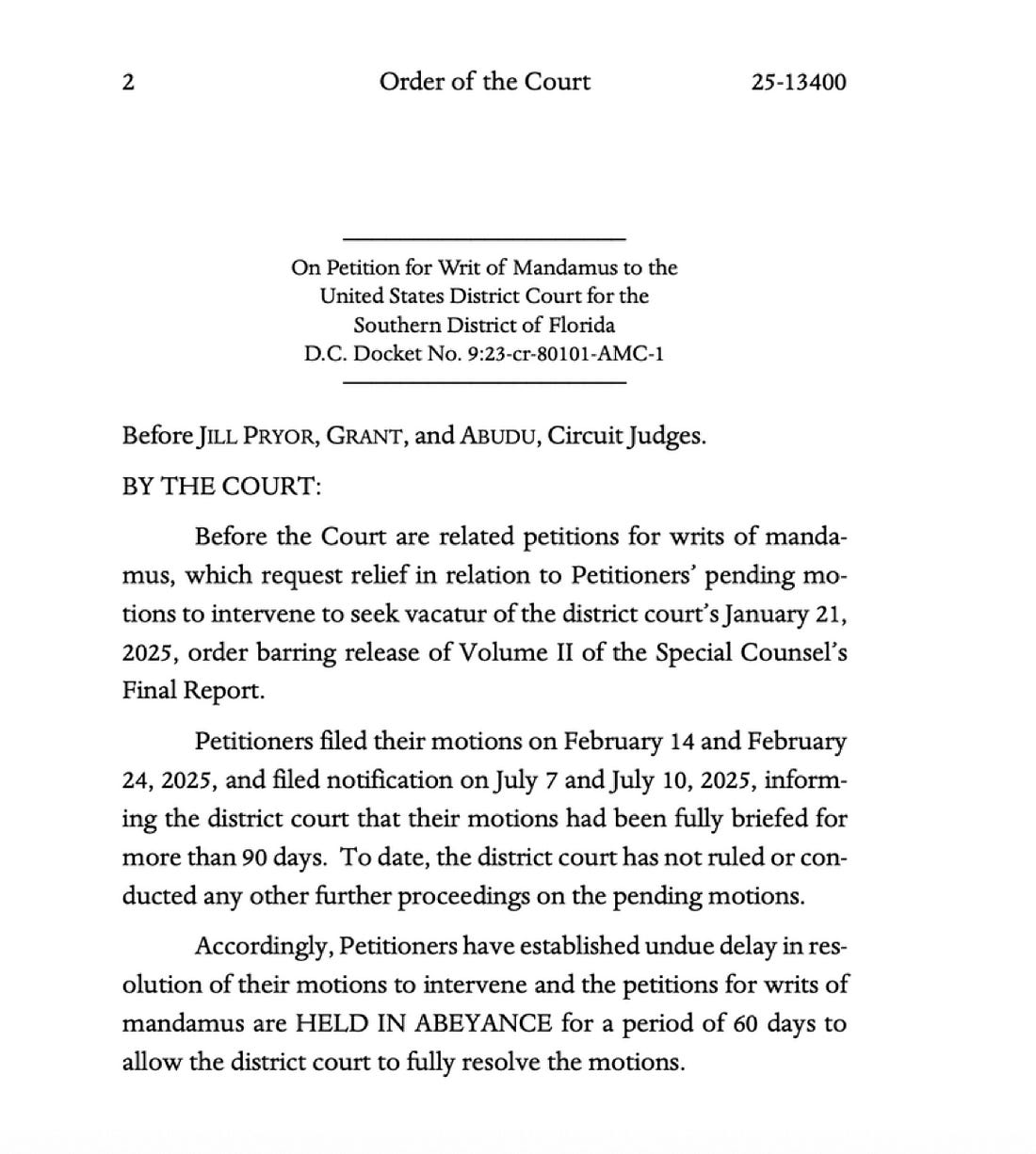 “We believe you possess information vital to our constitutional oversight responsibilities,” House Judiciary Chair Jim Jordan wrote to each of the four, according to a report from CNN. No word on whether the four will agree to interviews or wait for subpoenas. Presumably, Republicans have no more incentive to permit these witnesses to testify publicly than they do with Smith. But the Committee’s Republicans aren’t the only ones after information. Democrats want DOJ to release part two of Smith’s final report on the Mar-a-Lago case, which remains under seal. According to House Democrats, that report “details how Donald Trump knowingly retained hundreds of presidential and highly classified records at his Mar-a-Lago club and then deliberately defied subpoenas, obstructed law enforcement, hid evidence, and lied about his continuing retention of these records.” The lawsuit to release the report is still pending in the Southern District of Florida before Judge Aileen Cannon. House Democrats filed an amicus brief in that case and wrote to Attorney General Bondi, demanding that she release the report before Smith testified, so it would be fair game. “This Administration has repeatedly boasted that President Trump is ‘the most transparent and accessible president in American history.’ Your campaign to bury Mr. Smith’s report makes a joke out of that claim,” they said to her. “You are permitting prosecutors to be hauled before Congress to defend their work while denying Congress and the American public the written record that would explain it.” Judge Cannon has been dragging her feet on ruling on the release since January. American Oversight, a bipartisan group that works to expose misconduct and hold government accountable, filed a petition for mandamus, asking that Judge Cannon be ordered to rule. The Eleventh Circuit, in a rare move, granted that request in November and gave the Judge 60 days to get it done, finding she had engaged in “undue delay.” Expect Judge Cannon to take virtually all of those 60 days before she rules, although perhaps Trump’s lawyers, at least those of them who haven’t joined his new administration, will seek further delay. |