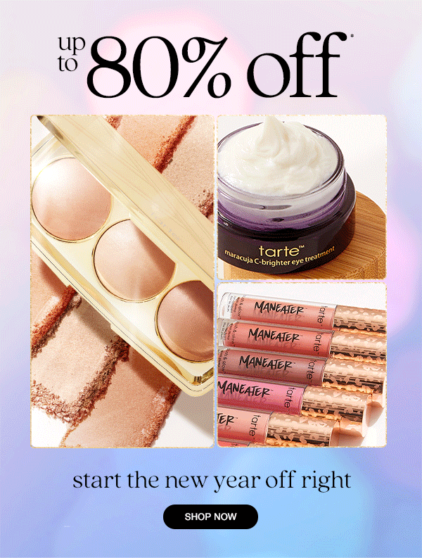 *Up to 80% off is valid only on items within tarte.com. No code needed—prices are as marked. Offer applies to in-stock items only and can’t be combined with other codes, offers, or discounts. Not valid on previous purchases or for cash or credit. Select items may be excluded and will be marked on their product pages. Taxes, shipping, duties, VAT, and other fees may apply. tarte™ has the right to cancel any orders due to unauthorized use of our website, technical error, or violation of our Terms of Use. Offer may change or end without notice. Valid from December 22, 2025 at 10:00AM(ET) through January 2, 2025 at 9:00AM(ET).